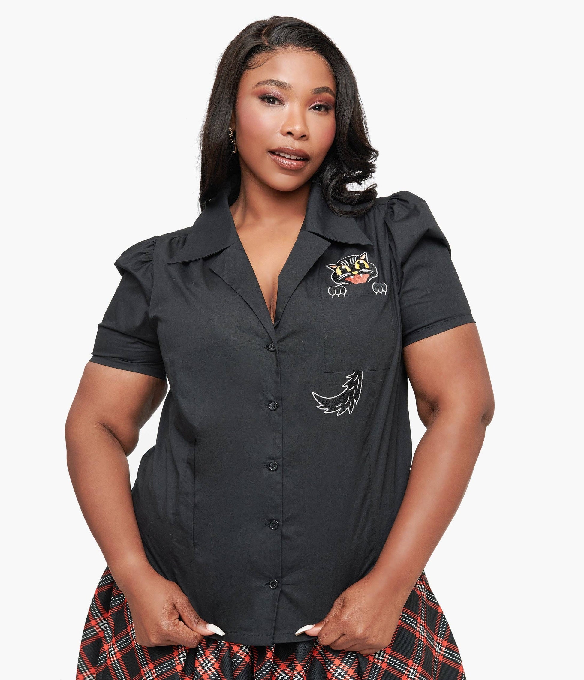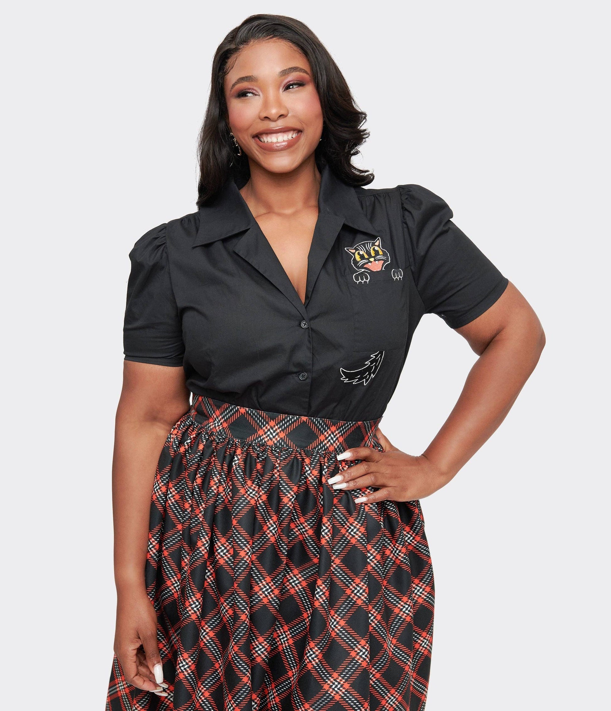 This 40s-style woven stunner has a timeless black shade decorated with an eerie black cat design. With a front button and short sleeves, this collared top adds retro charm to any ensemble.