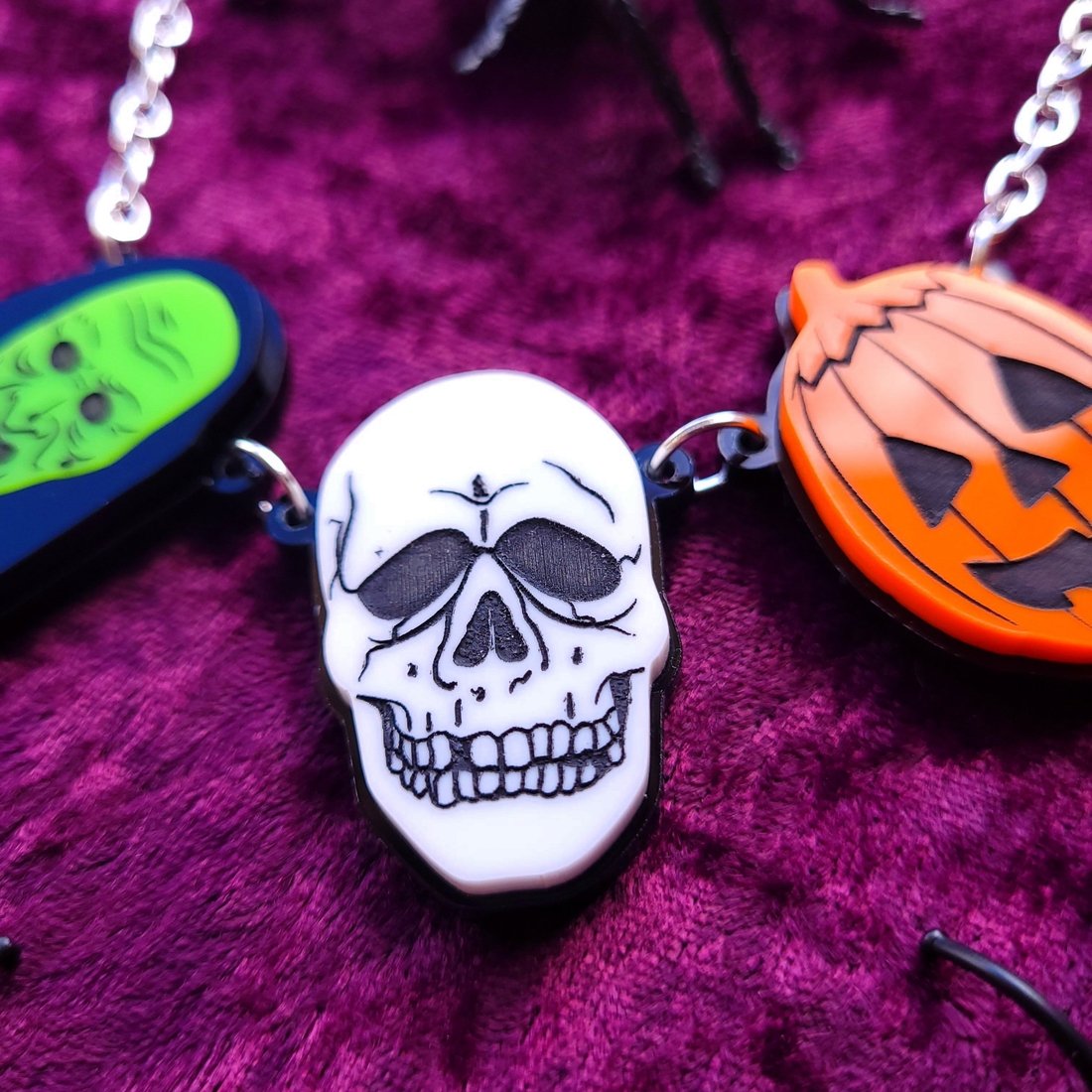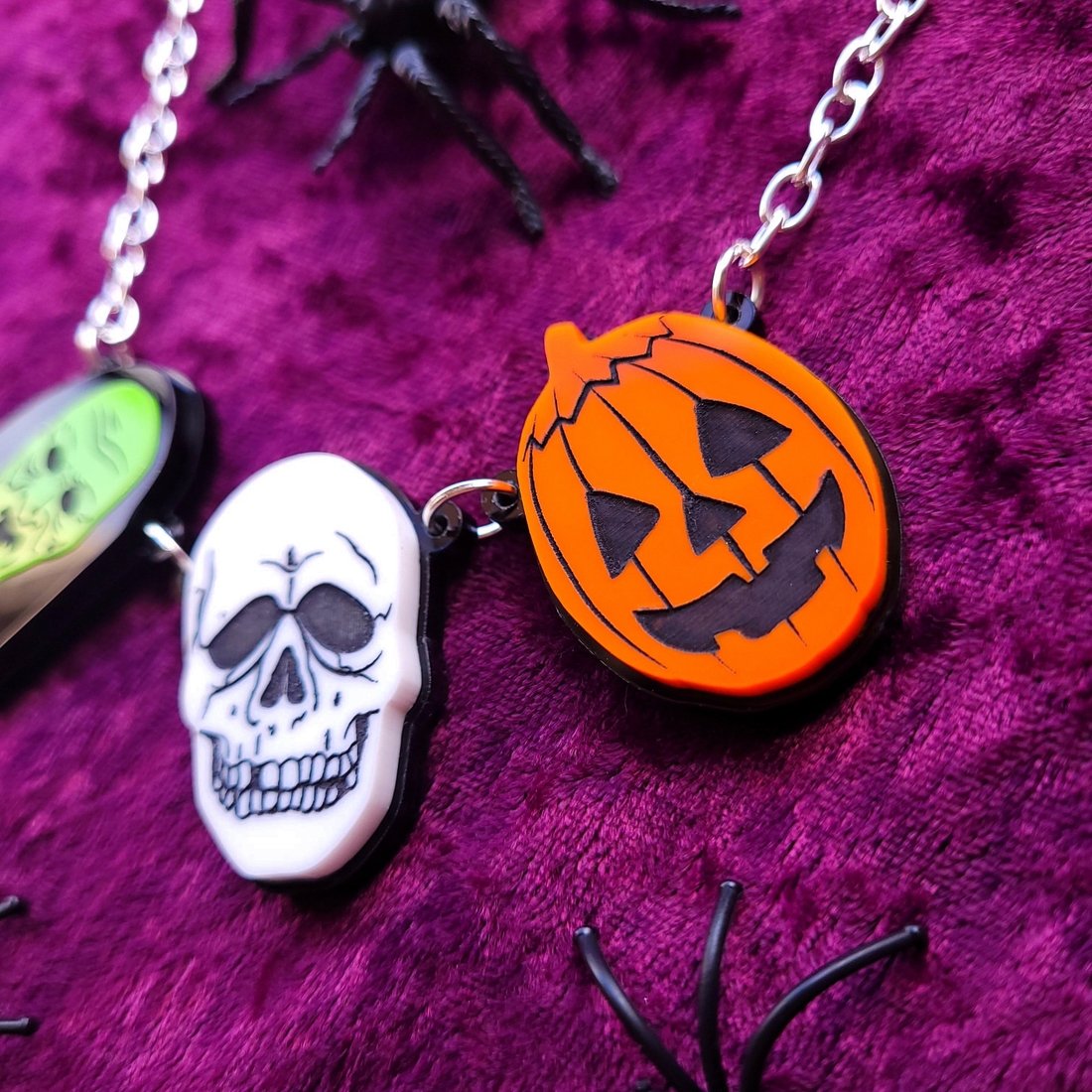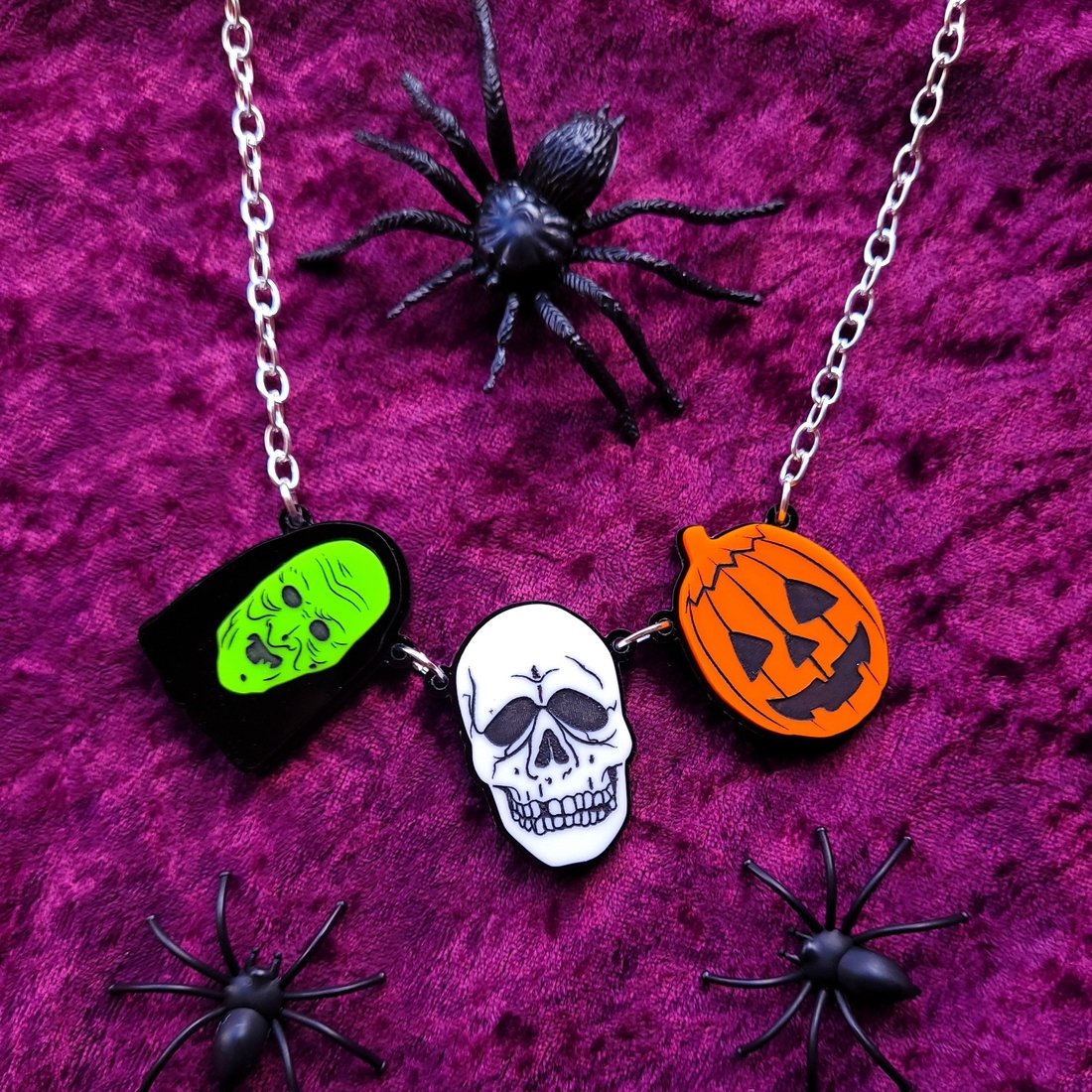 Happy Happy Halloween!! Silver Shamrock!! We took a little inspiration from one of the weirder horror sequels for this Halloween themed piece! Featuring a witch, skull and pumpkin mask laser cut and handmade using acrylic, with engraved detail.