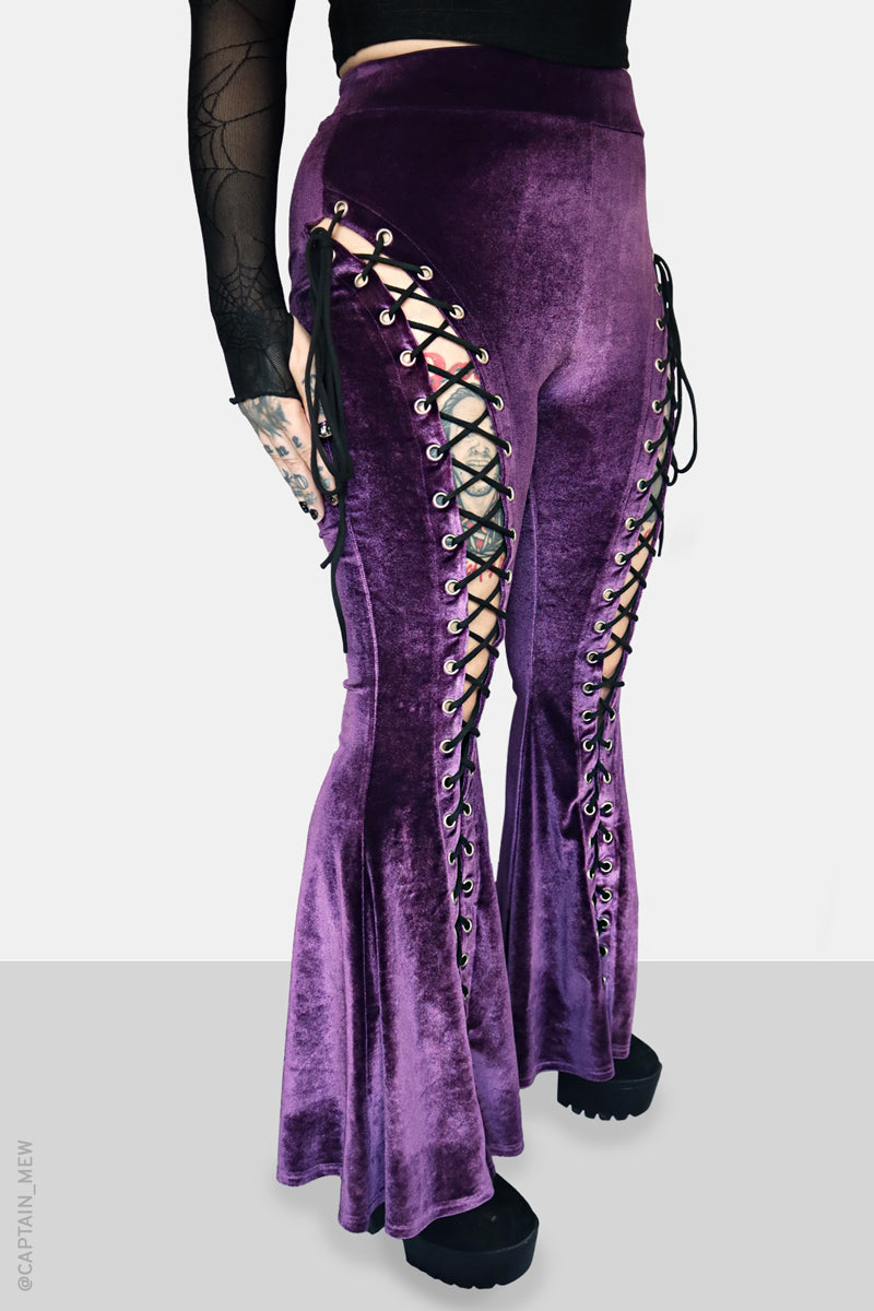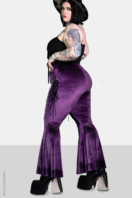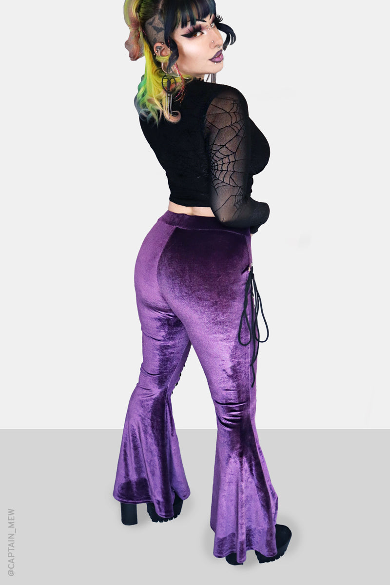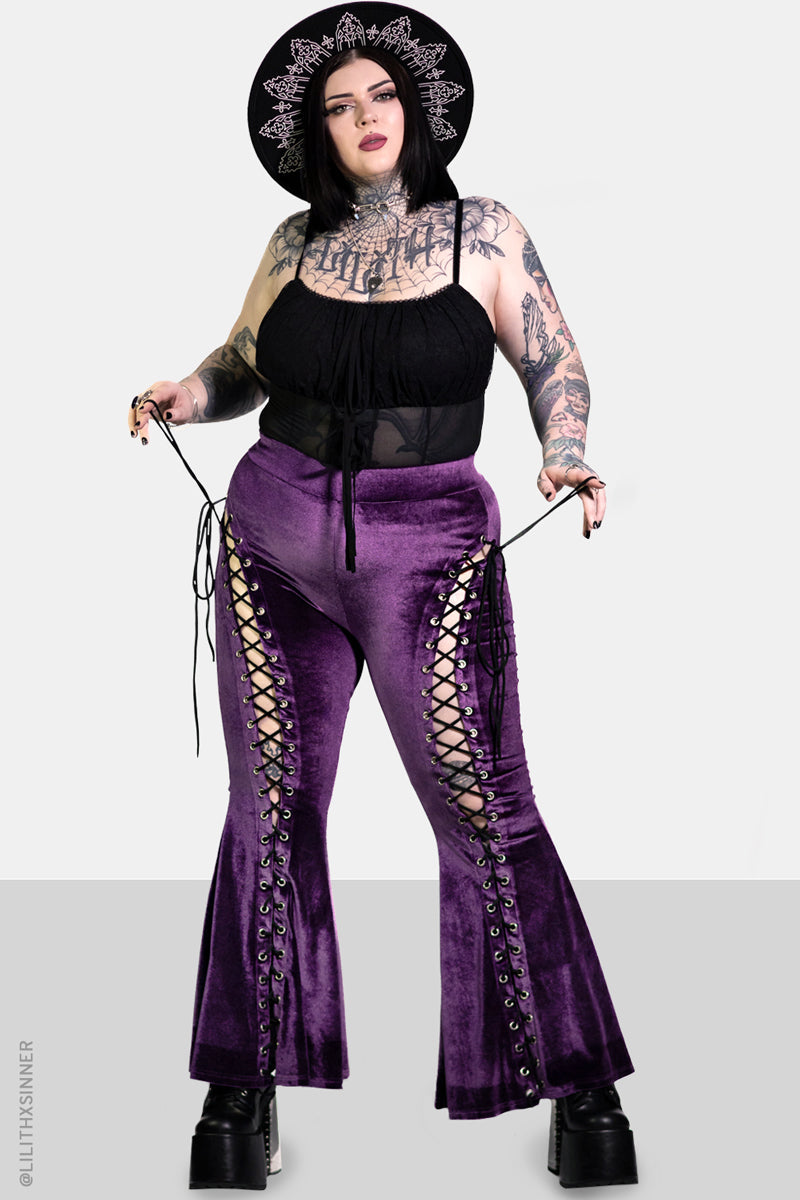 The Alice Flare Pants go whimsigoth with the newest color way and style! The Alice Lace Up Flare Pants by Forest Ink feature dramatic corset details (that don't expose your underwear!), a stretchy elastic waistband, and their favorite velvet fabric. Throw your favorite band tee or hoodie on top for a casual look, or pair with your favorite going out top for a comfy but cute look out!