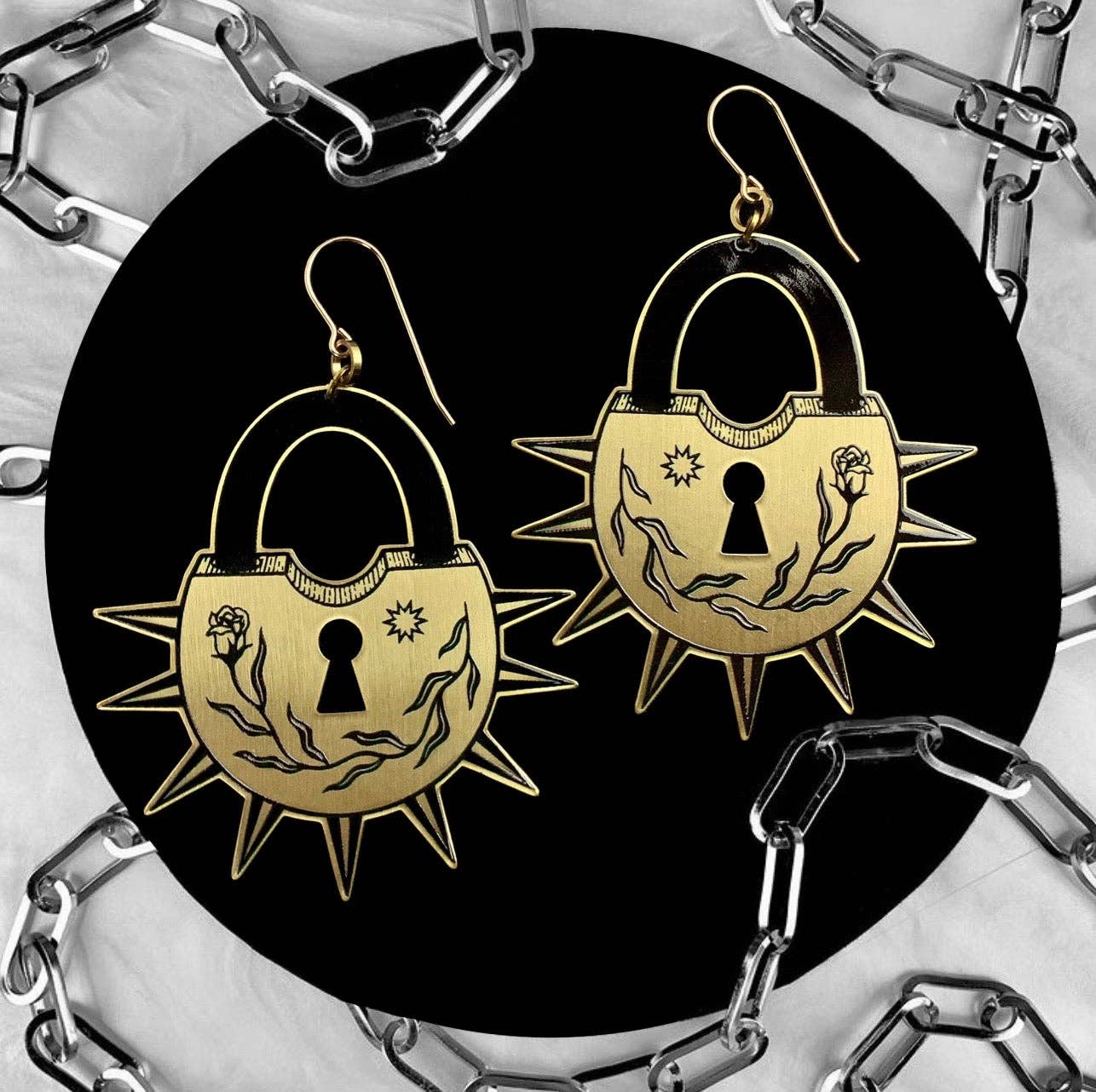 Discover your new favorite statement earrings with the Armatura Lock design from While Odin Sleeps! Crafted from durable brass, these earrings feature gold-filled hooks and glossy black details for a sleek and stylish look. Coated to protect against oxidation and to make cleaning a breeze, these earrings are the ultimate in low-maintenance accessories. With a length of 2.50" and a width of 2.10", they are lightweight at just 0.11oz per earring. Order now and add a touch of passion to your earring collection!