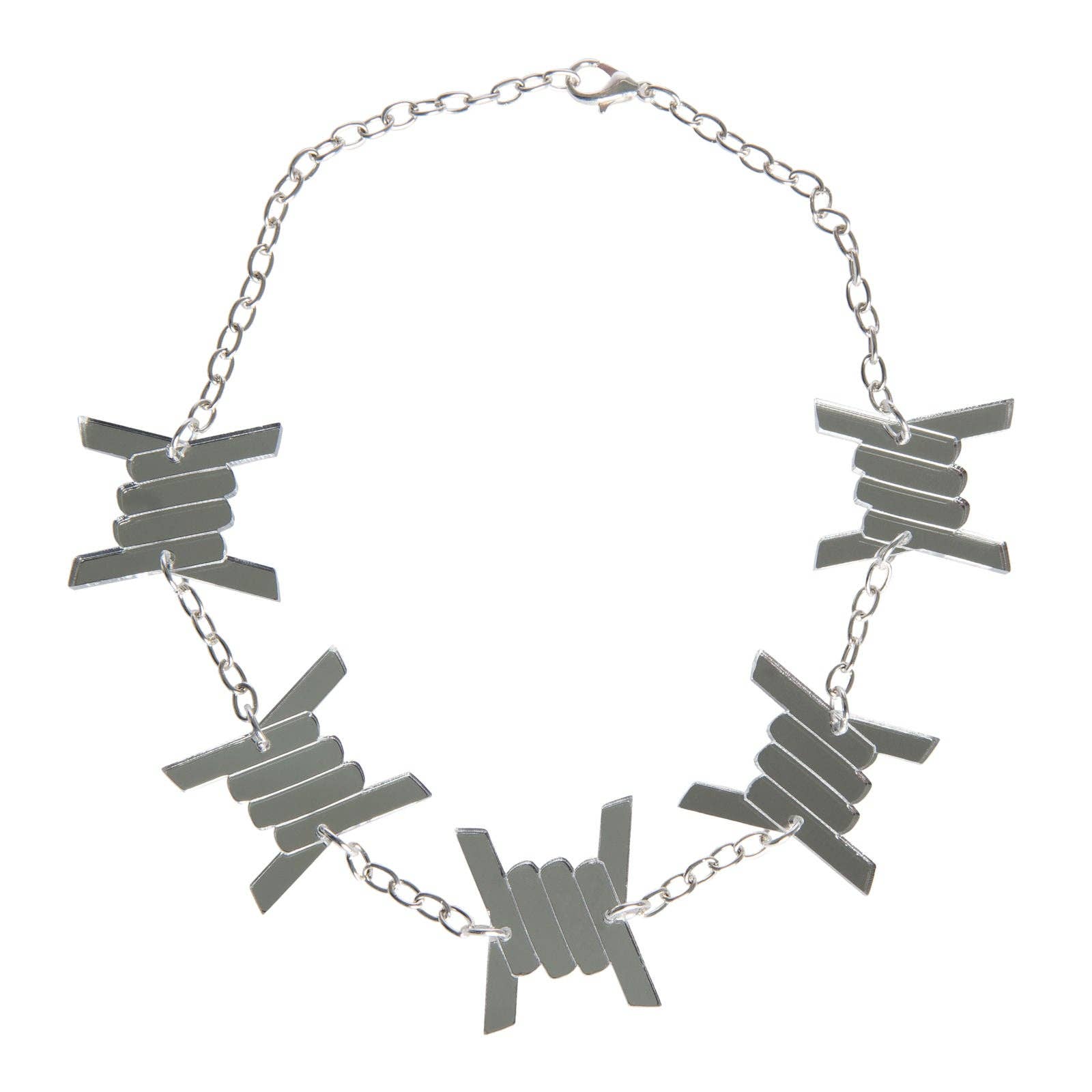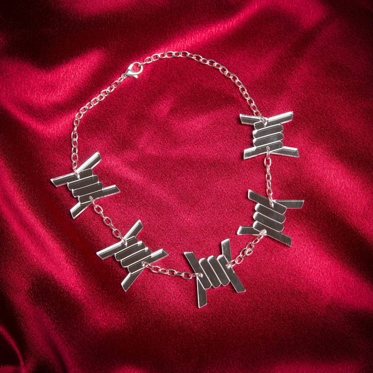 This edgy choker is made from five laser cut and engraved "barbed wire" charms that are interlinked with silver components and plated chain. Designed to be worn as a choker at 13" silver plated chain all the way around.