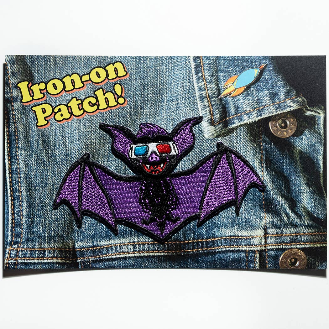 The Batty 3D patch features a cute, purple bat wearing 3D glasses. This 4" embroidered iron-on patch is lightly attached to a 4 x 6" double-sided post card and enclosed in a protective plastic sleeve.