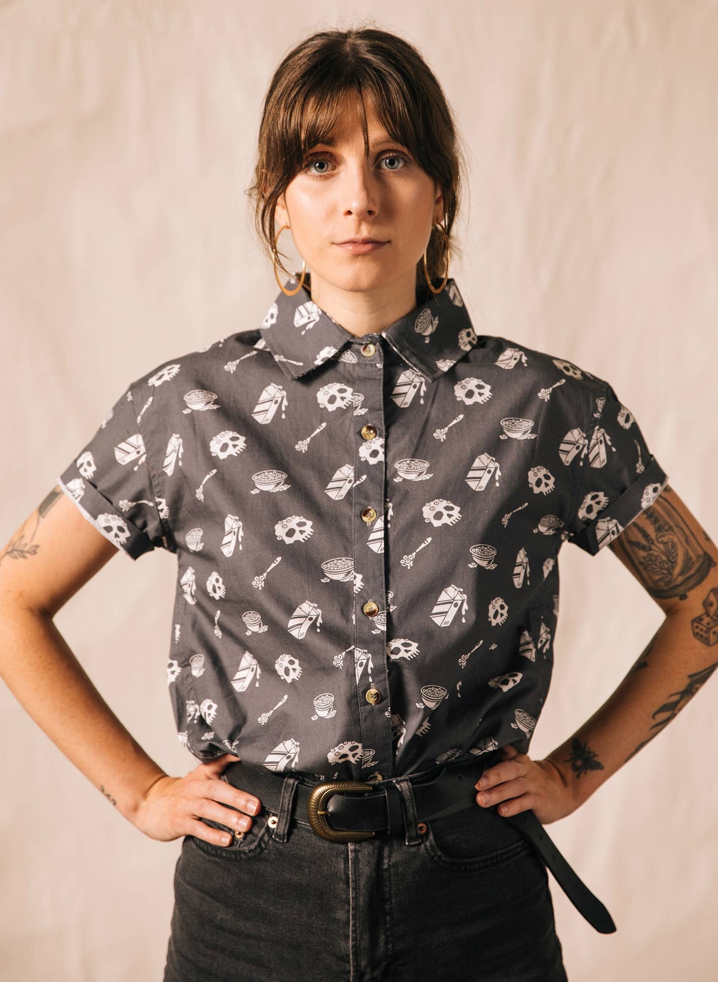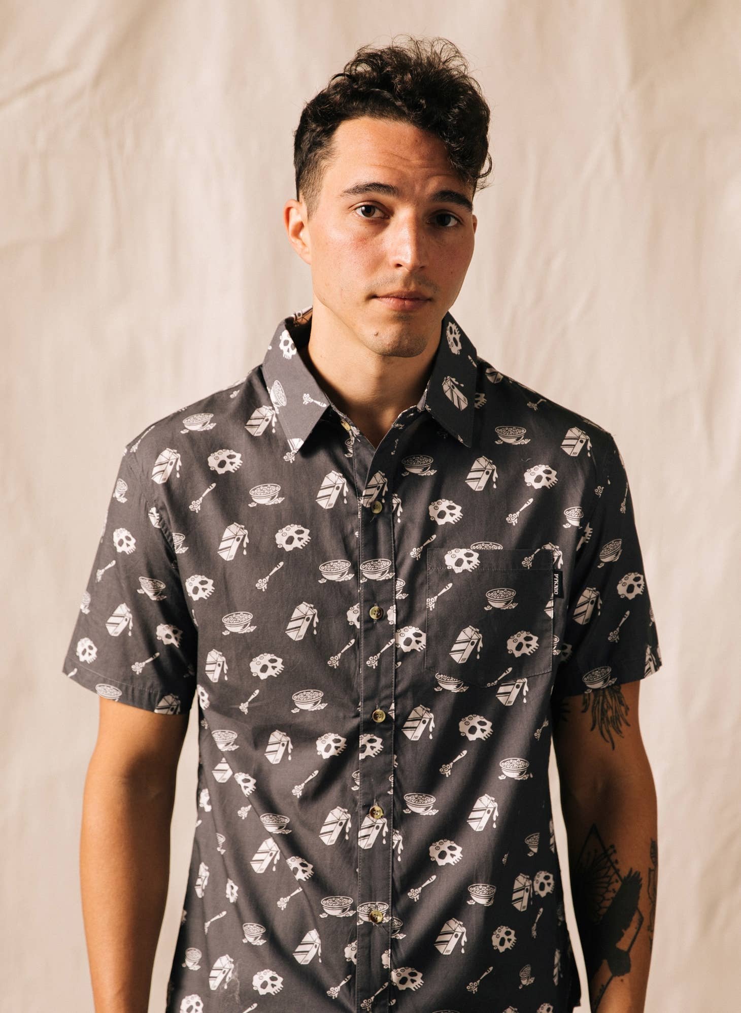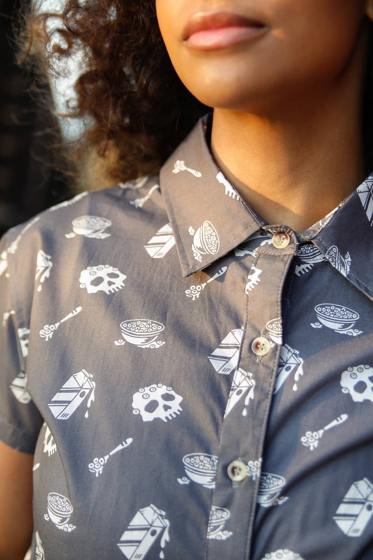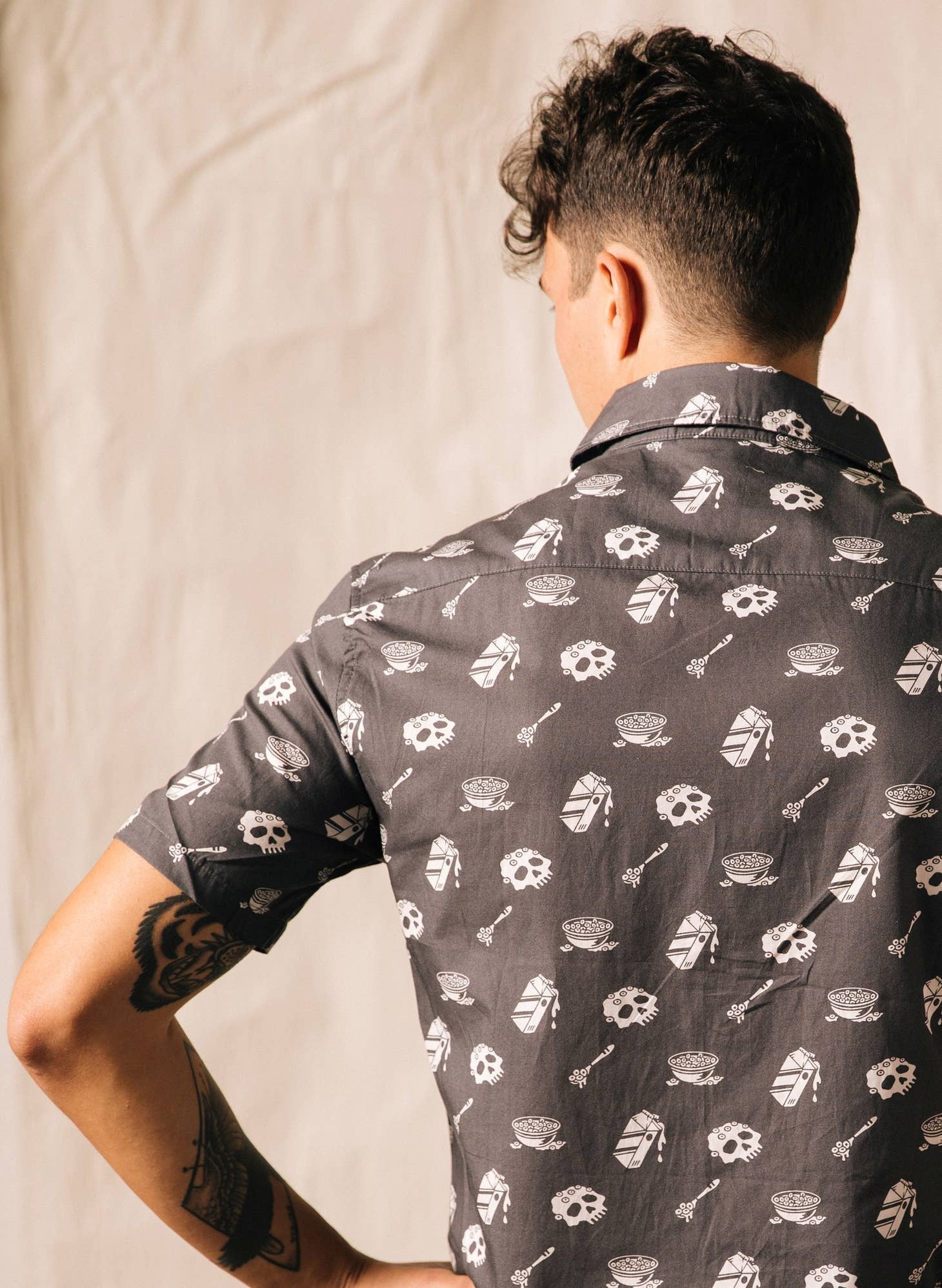 Stay sophisticated while not-so-subtly letting everyone know you kill bowls of cereal for a living. The 'cereal killer' is a fun casual button down cereal shirt with a unique all-over print breakfast food design consisting of cereal, milk, cereal bowl, and spoon icons. The edgy cut and sew button up food shirt is made of poplin cotton fabric and has a pocket at the left breast. This quirky, collared shirt with foodie graphics is not your father's hawaiian tiki shirt!