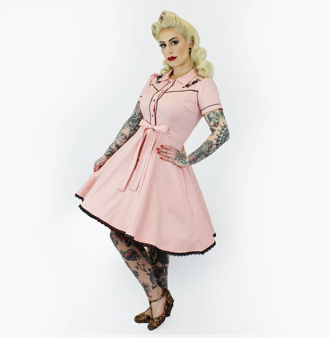 Step into the Wild West with this super cute vintage-inspired Western dress! Featuring delicate black embellishments and intricate black rose embroidery on top. The bottom of the dress skirt is adorned with a black lace trim that adds to the dramatic contrast between the sweet peony pink and black touches. Handcrafted with attention to detail, this dress seamlessly blends Western flair with vintage aesthetics. Truly a standout piece for any special occasion.