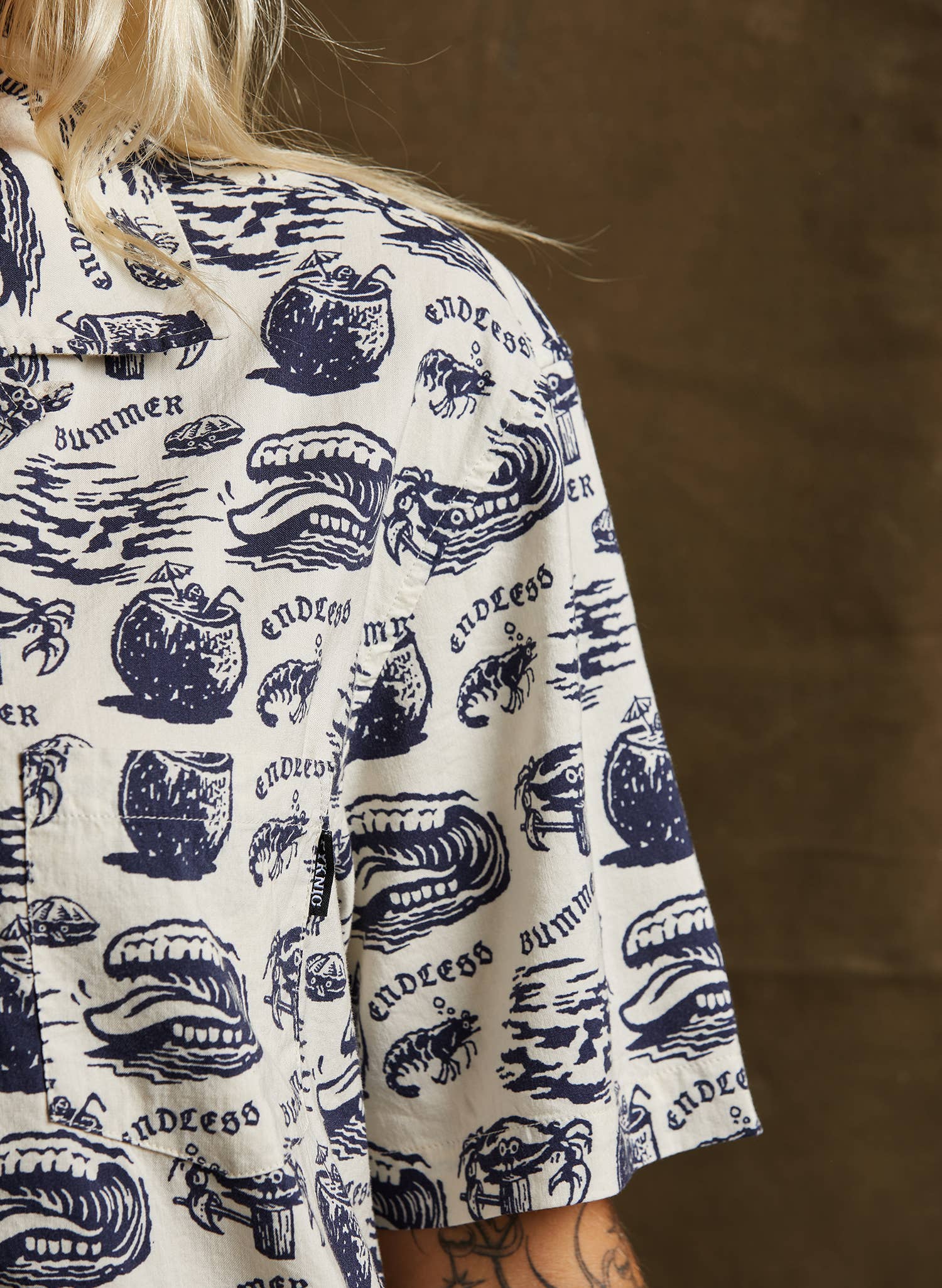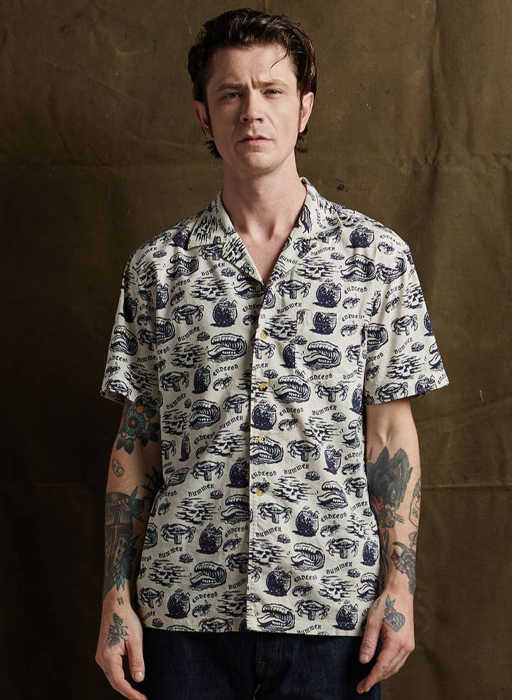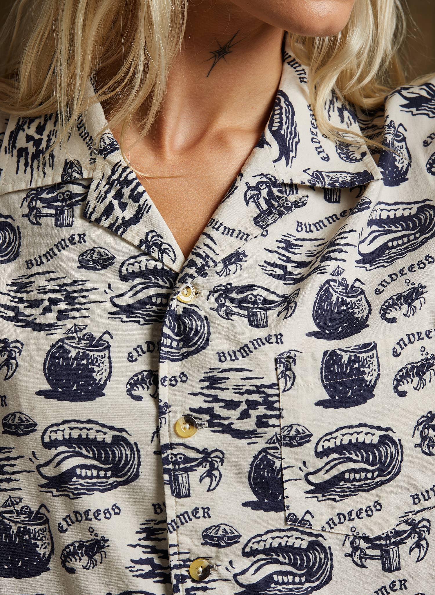Features: Super Comfy, Well Made Cotton Blend Fabric. Unique All-Over Print Design Vacation Shirt Collar Tortoise Buttons Available in Ecru Love the Fit? Then please hang dry! Do not put in the dryer.