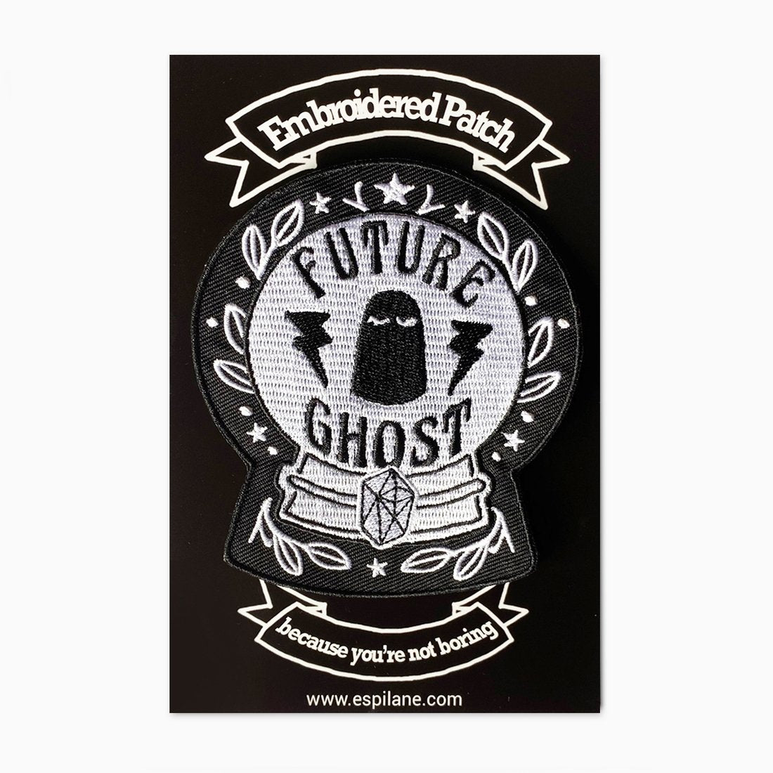 Cute & Ghoulish Future Ghost Large Patch • artwork designed by EspiLane • 3.5x4" / 9x10cm • 100% embroidered with iron-on backing • each patch comes mounted on a card with use instructionsMade in the USA