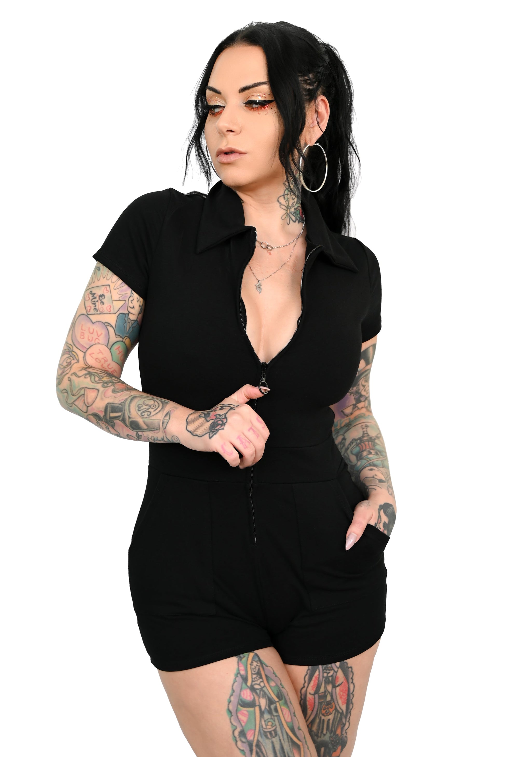 Made out of a soft stretch black French Terry, with a black o-ring zipper front.
