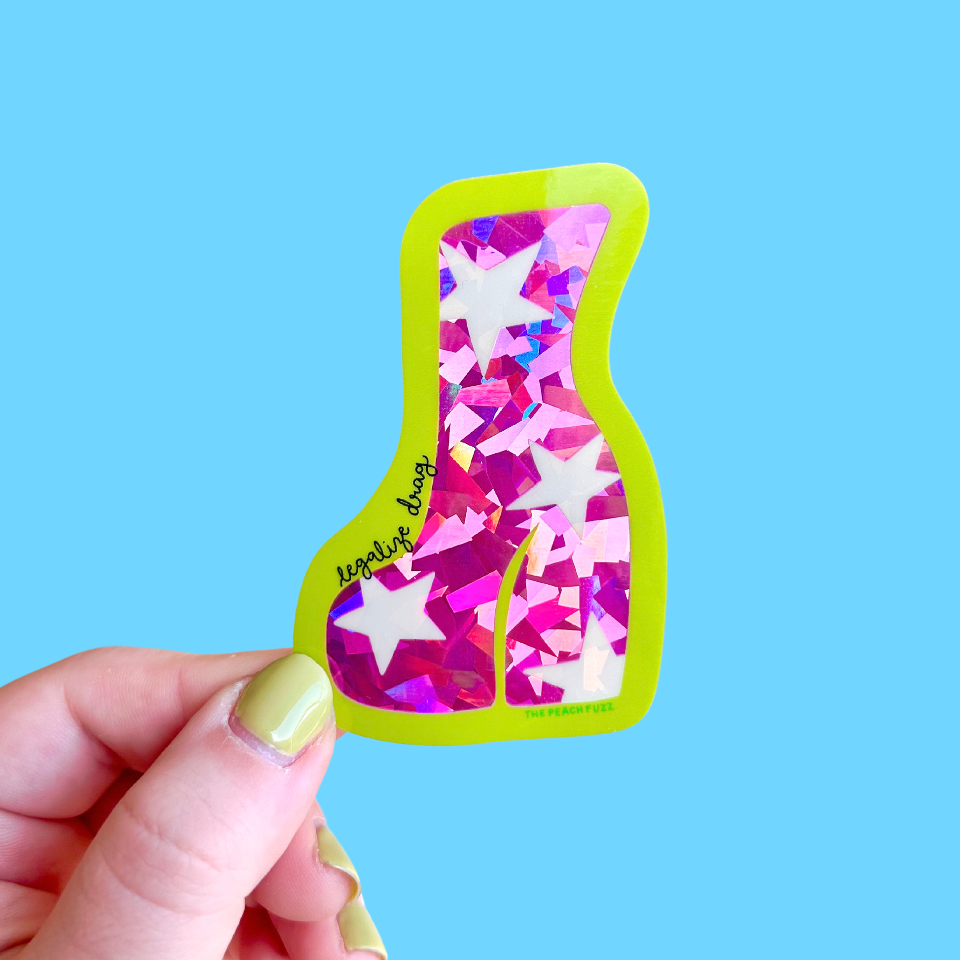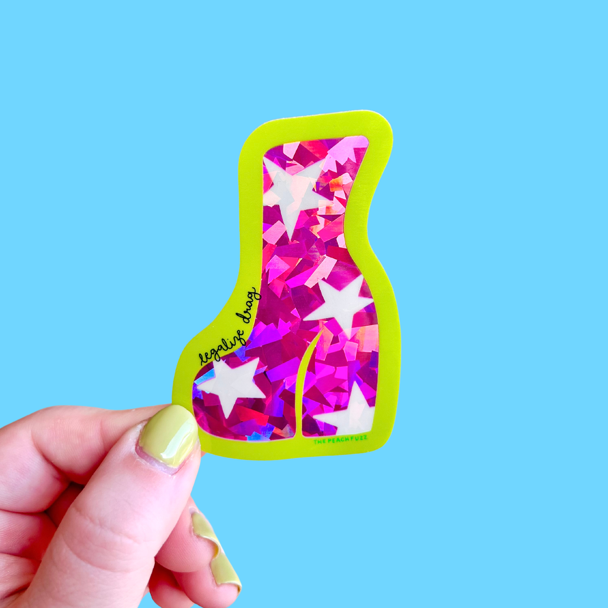 Drag is not a crime!!!! Show your support for the brave warriors that are drag performers with this "Legalize Drag" sparkle stickers, featuring a star printed boot worthy of a drag queen.