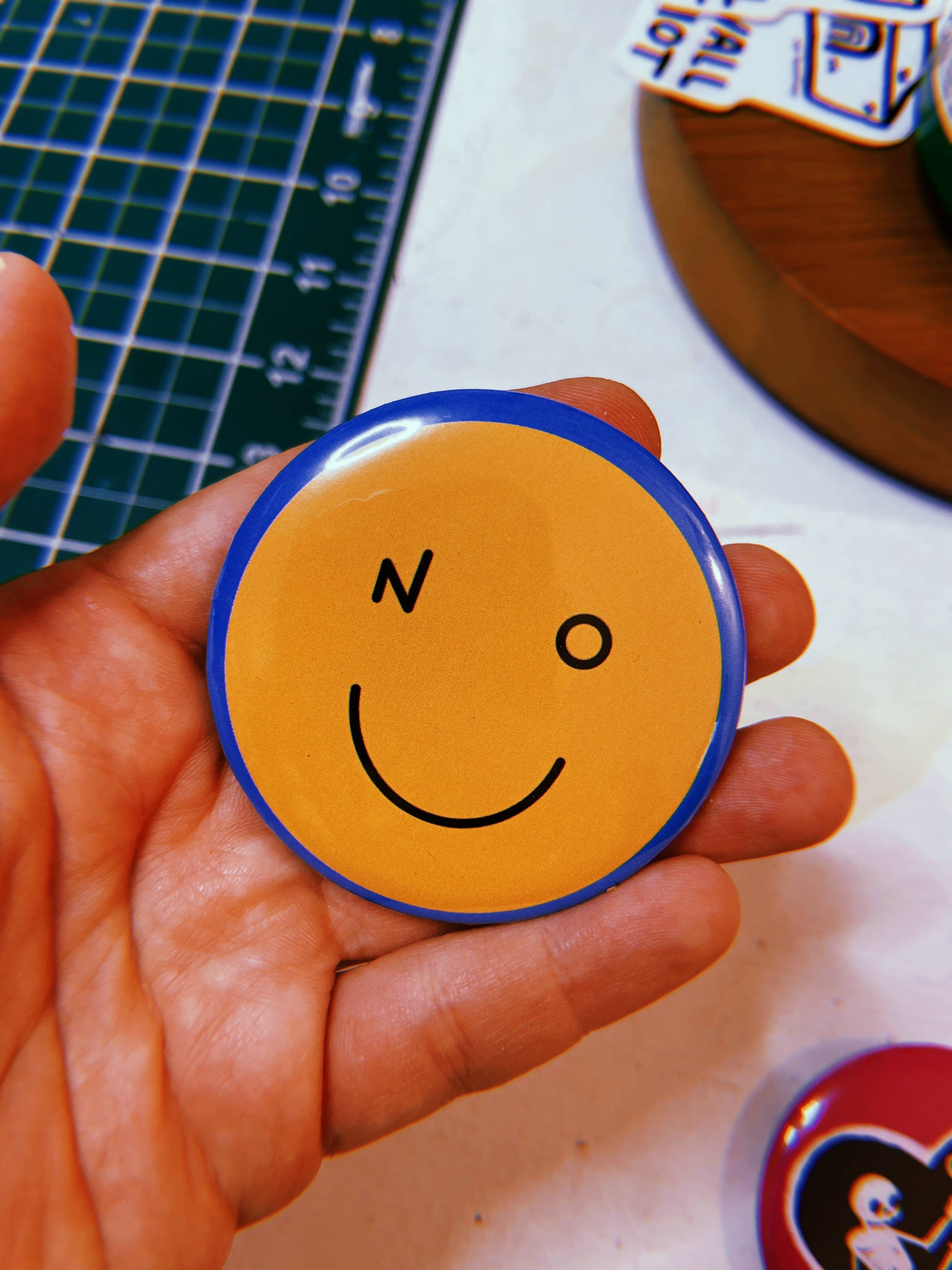 A bright yellow smiley saying NO on a blue background -- for those of us practicing boundary-setting. This is a mylar-sealed steel-and-plastic pinback button that measures 2.25".