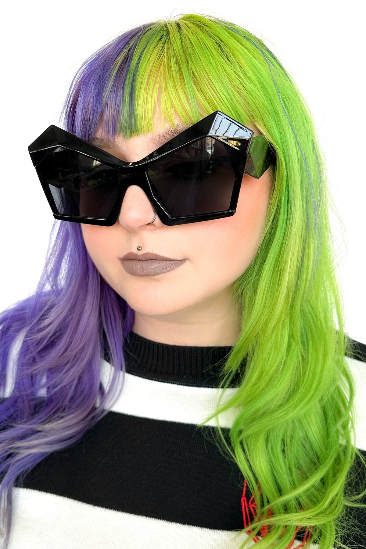 Oversized geometric black sunglasses with unique diamond shaped arms. Black on black Foxblood logo on the left arm