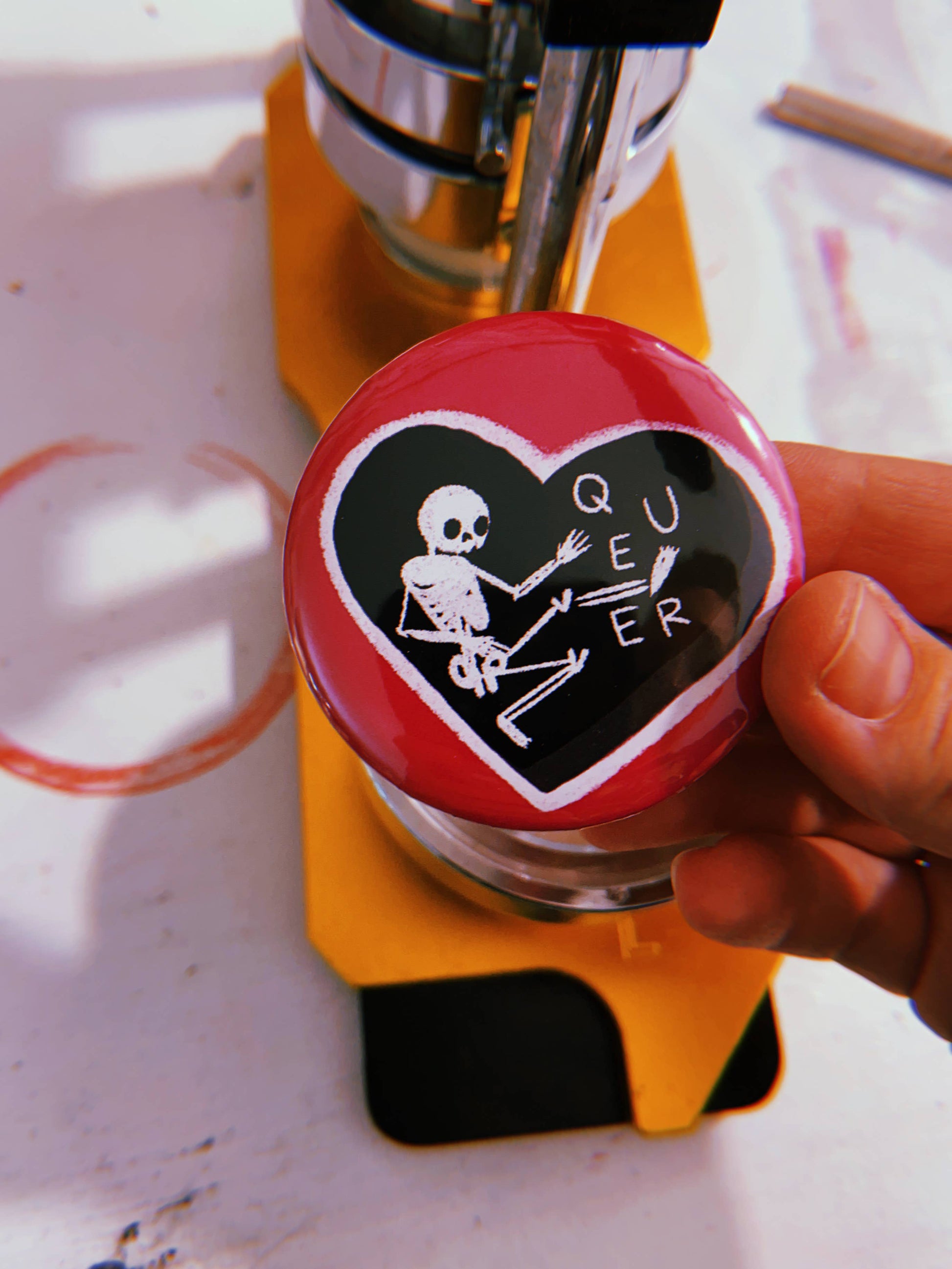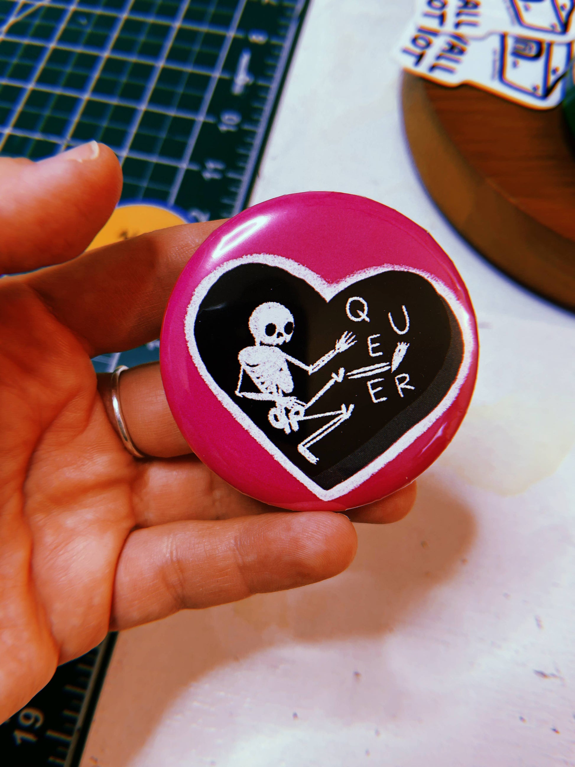 A cute little skeleton with the word QUEER inside of black heart on a hot pink background. This one is super popular with the youth, of which I am no longer one. But the LGBTQ kids love it. This is a mylar-sealed steel-and-plastic pinback button that measures 2.25".