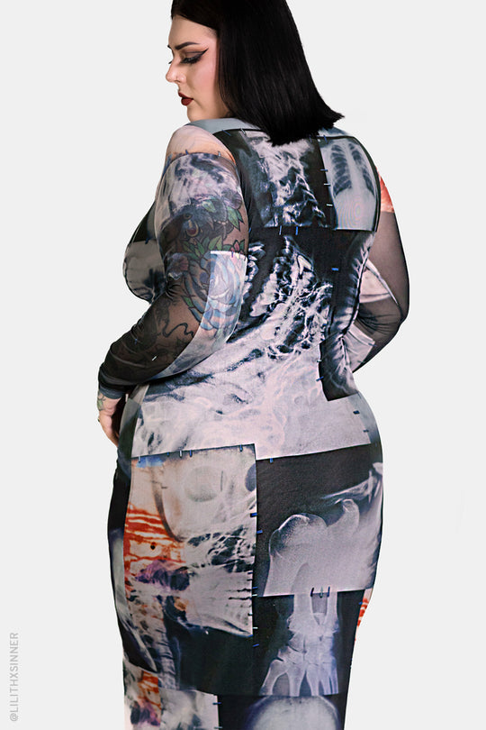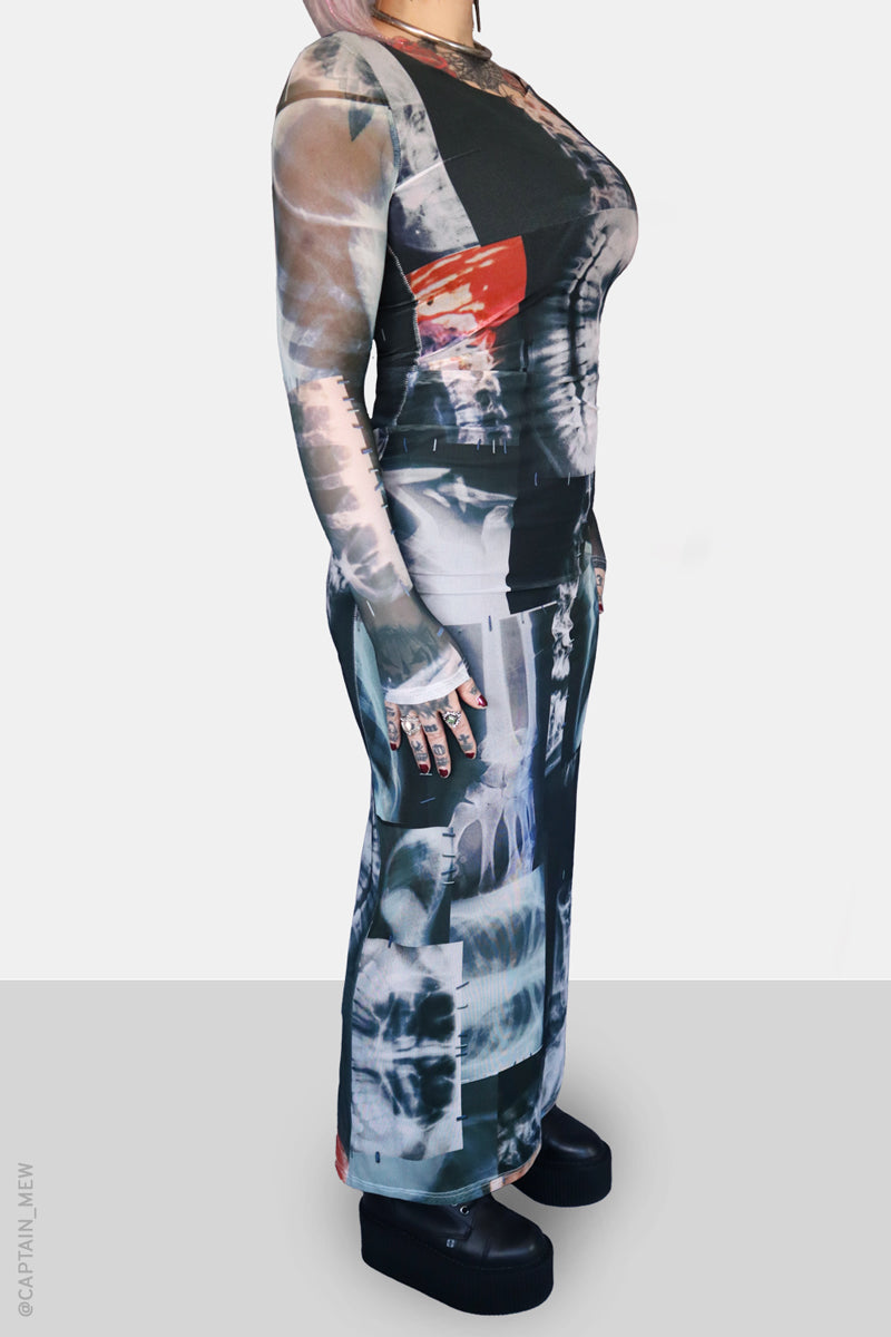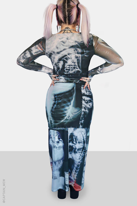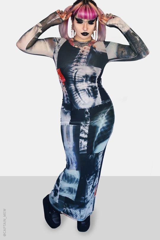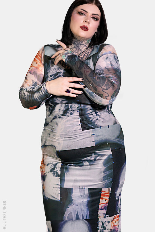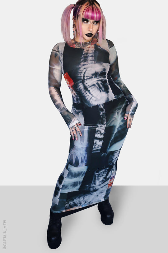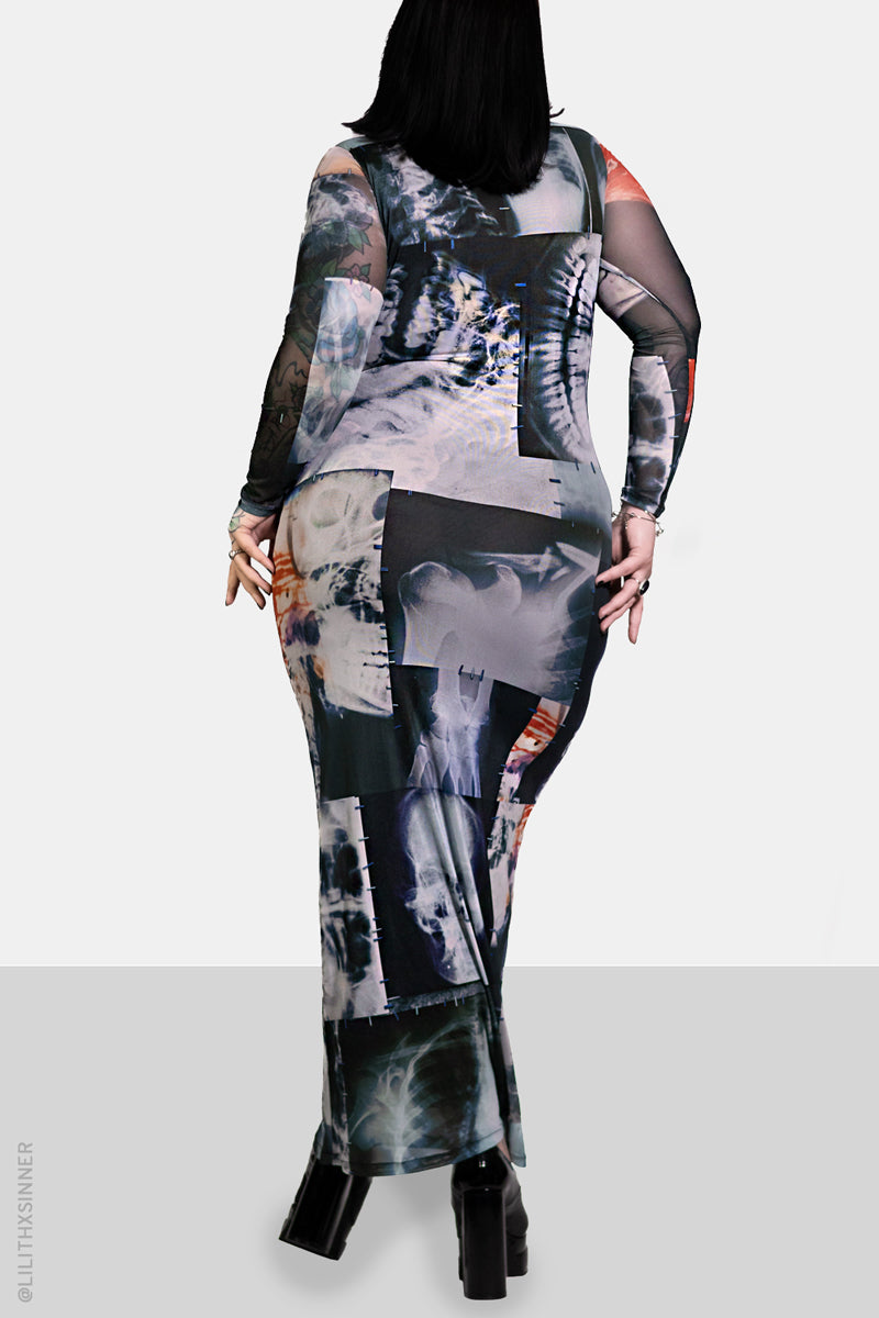 It's whats on the inside that counts, right? The Skeletal Maxi Dress features a super soft mesh construction, a soft black slip that covers everywhere except the arms, and a higher scoop neckline. The print placement may be slightly different on each piece due to the randomized cutting and construction.