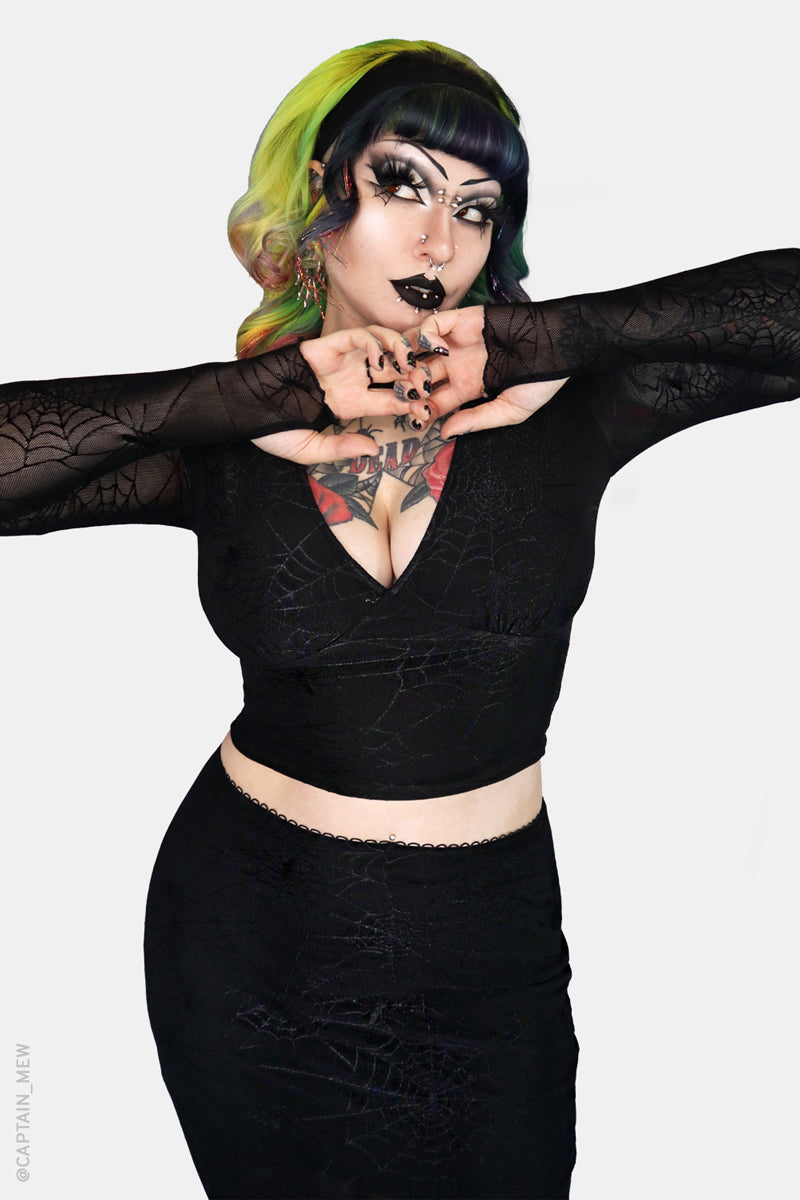 Mew is 5’2” and her measurements are: bust: 38”, waist: 30”, and hips: 38”. She usually wears S or M and is wearing size S. Instagram: @captain_mew
