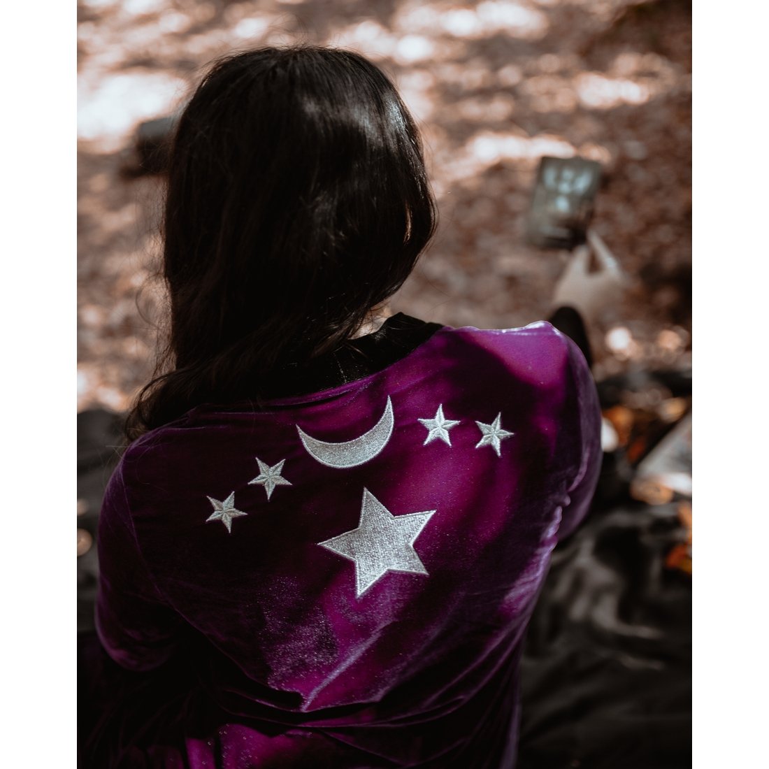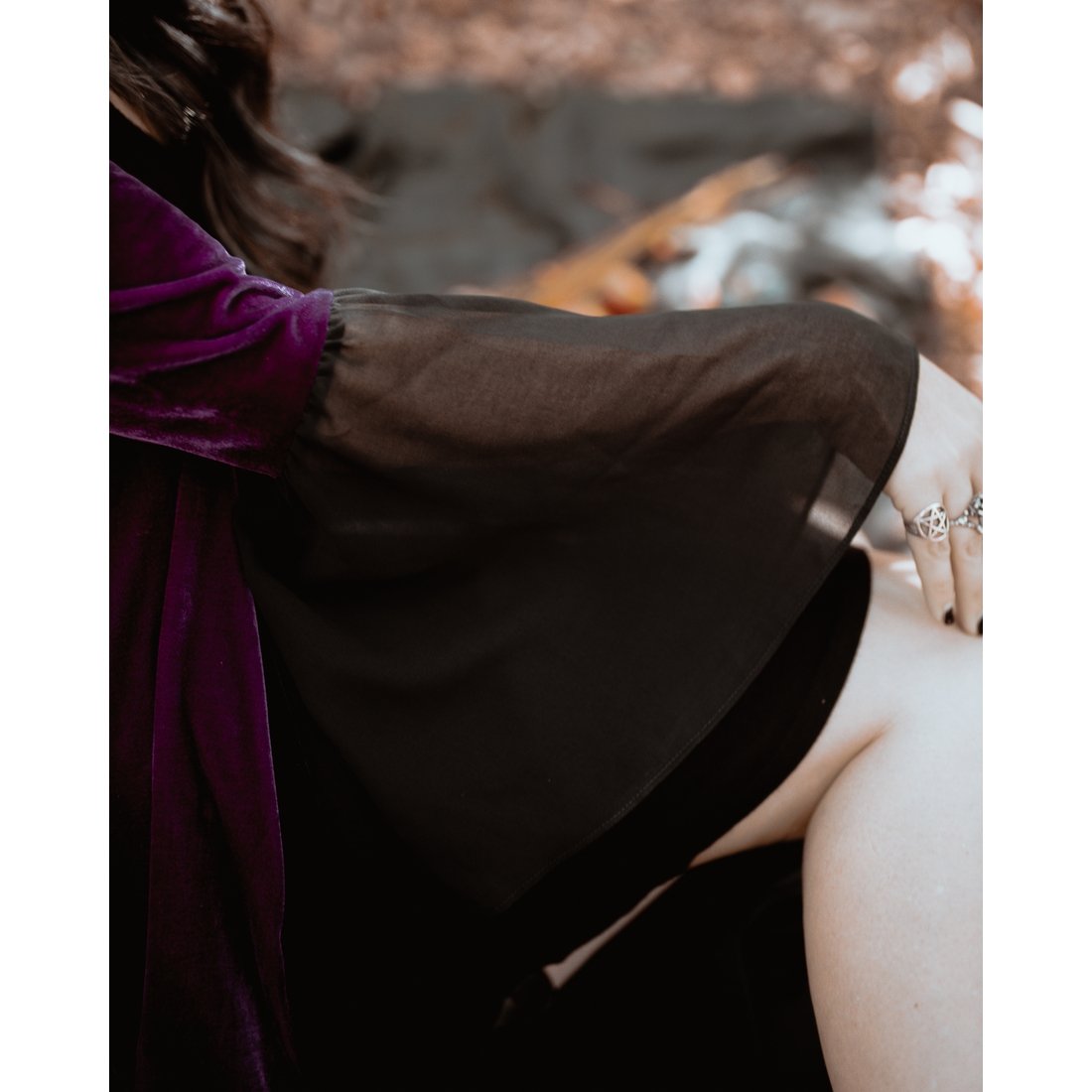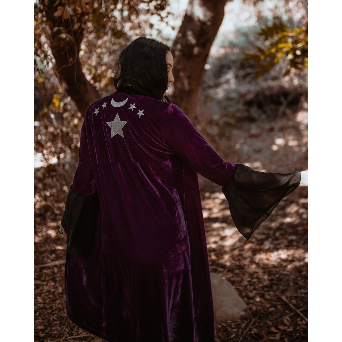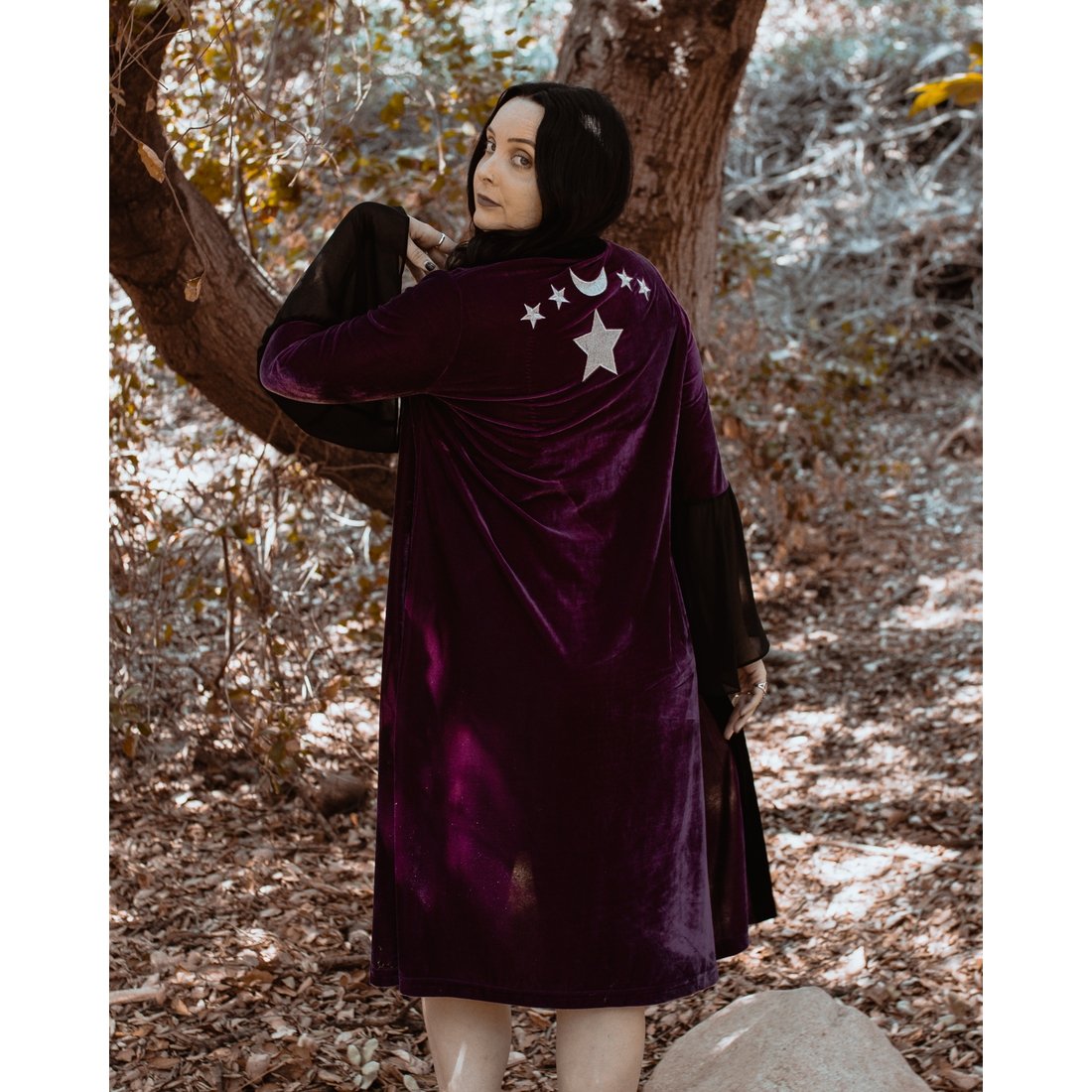 Deep purple velvet with black accents down the front and flowy black chiffon sleeves. Join the world of Halloweentown with a Pretty Cult twist. Inspired by The Pretty Cult’s trip last fall to St Helens Oregon the home and filming location of Halloweentown! The back of this piece is complete with silver metallic embroidered moon and stars.