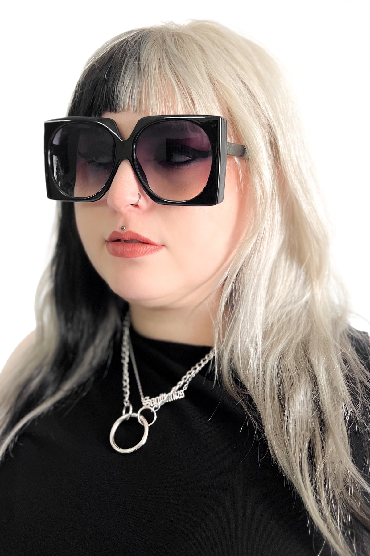 Oversized black square sunglasses with circle lenses. Black on black Foxblood logo on the left arm
