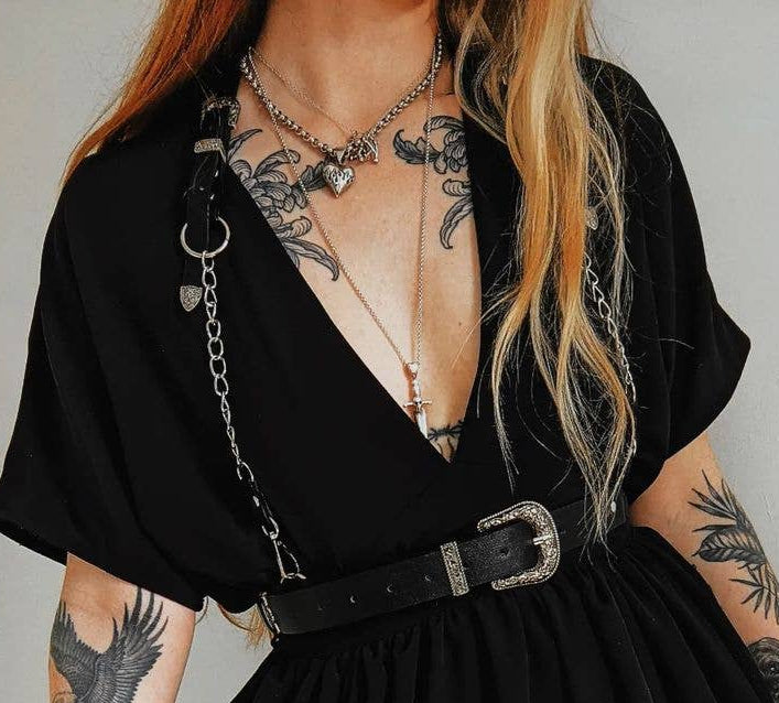 The ‘Sharpshooter’ Western Goth Chain Harness, a fierce chain harness as a part of Lively Ghost's Western Goth Series. Featuring western buckles, silver chain, & dreary black vegan leather. This western style harness is an accessory to accompany all y'allternative looks. Adjustable, to be buckled to fit you best.
