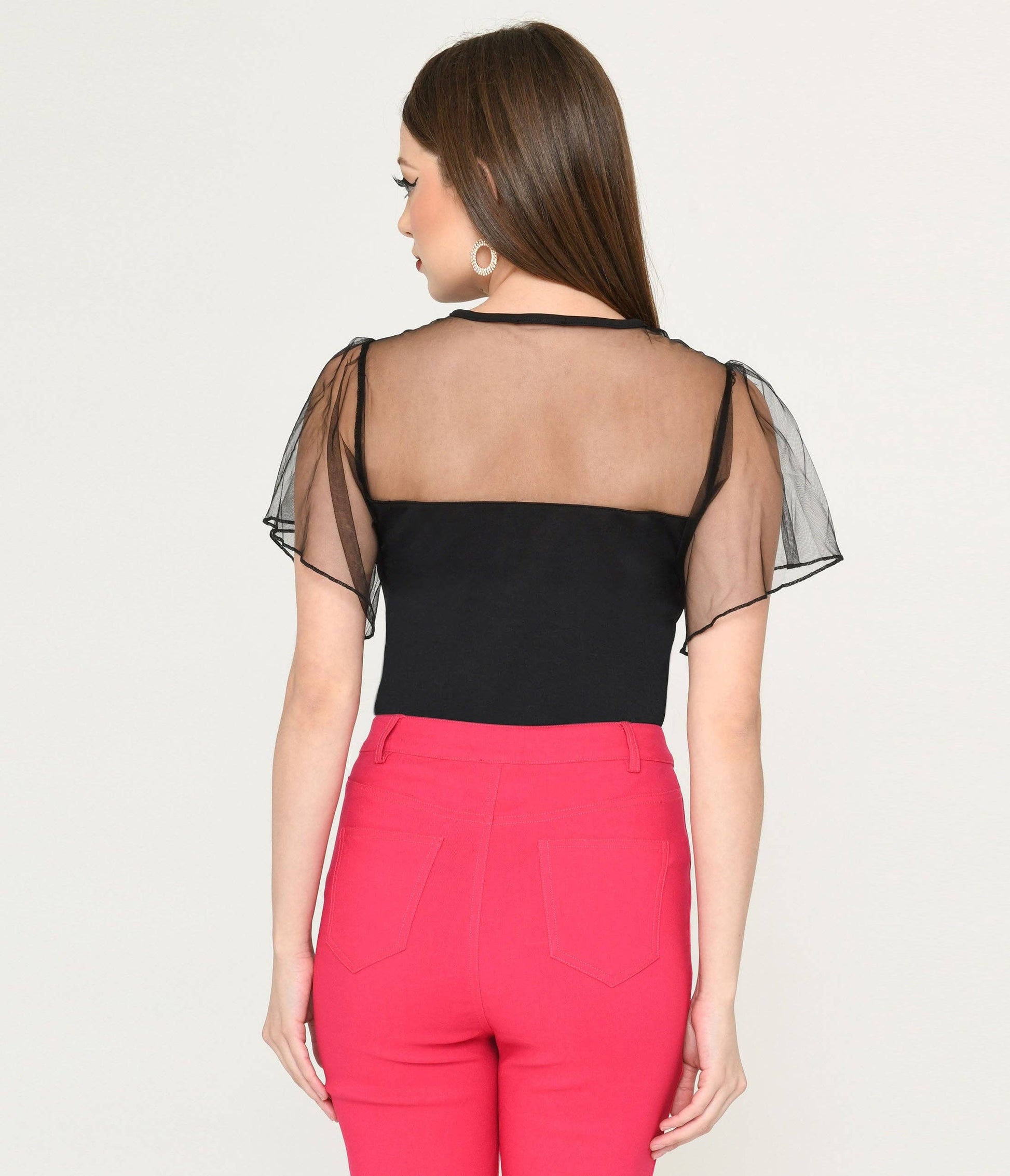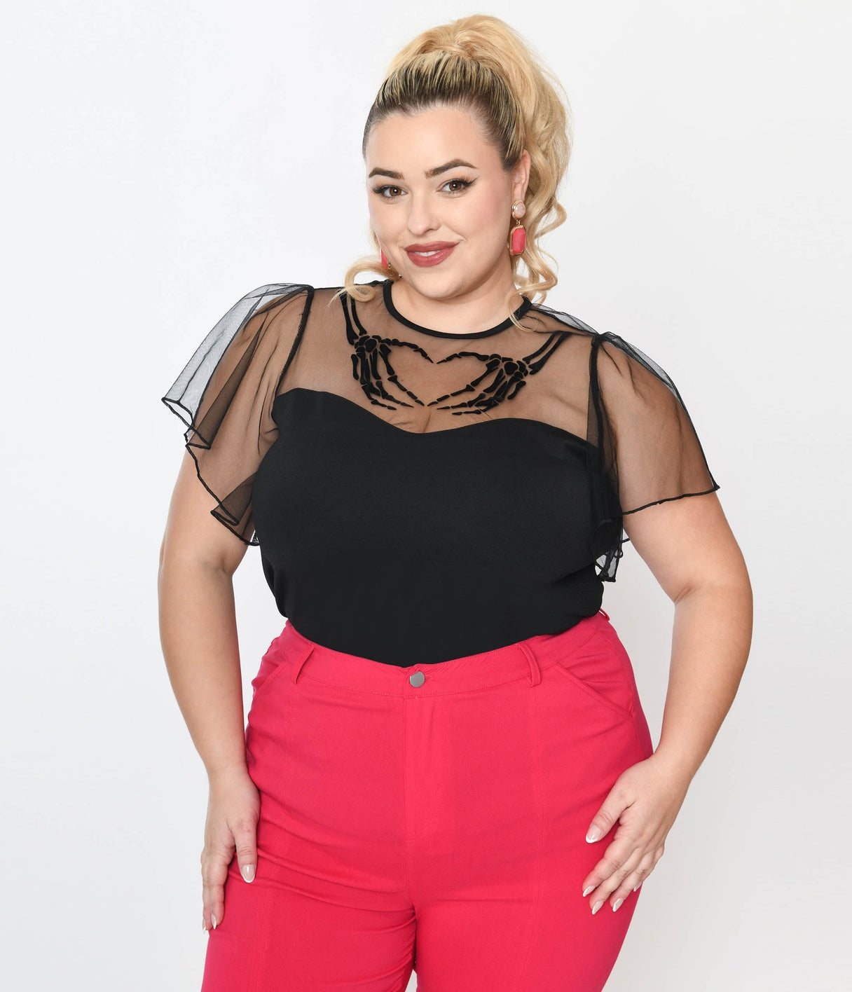 Get ready to add some spook-tacular style to your wardrobe with this Black Flocked Skeleton Hand Heart Flutter Sleeve Top! Crafted in a hauntingly beautiful black knit, the illusion sweetheart neckline is made of a black mesh and adorned with flocked skeleton hands in the shape of a heart. It's the perfect top for those who love to mix sweetness with the macabre.