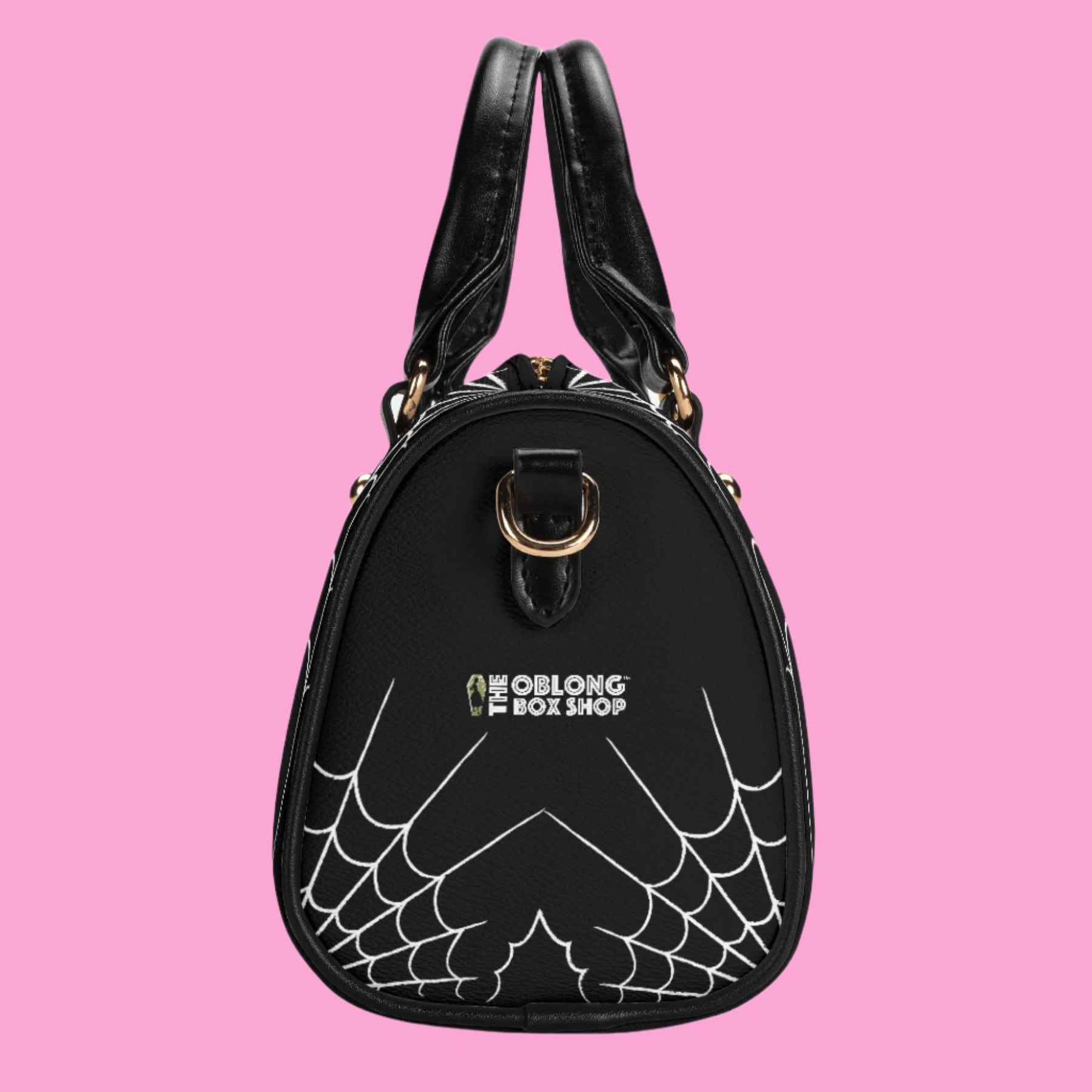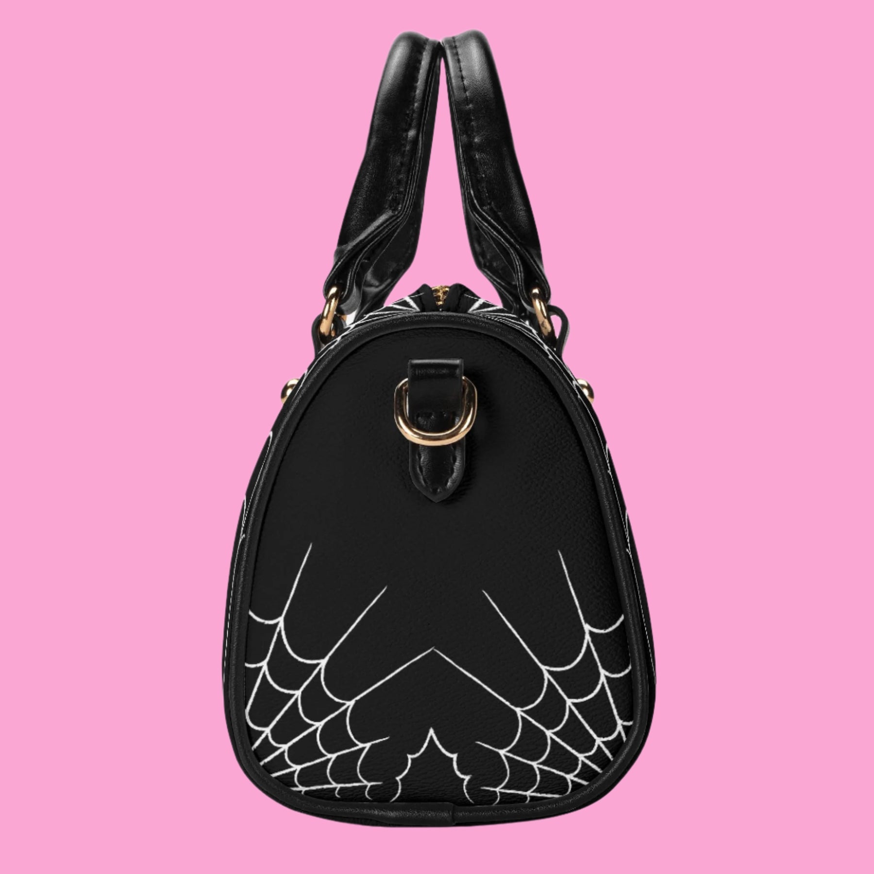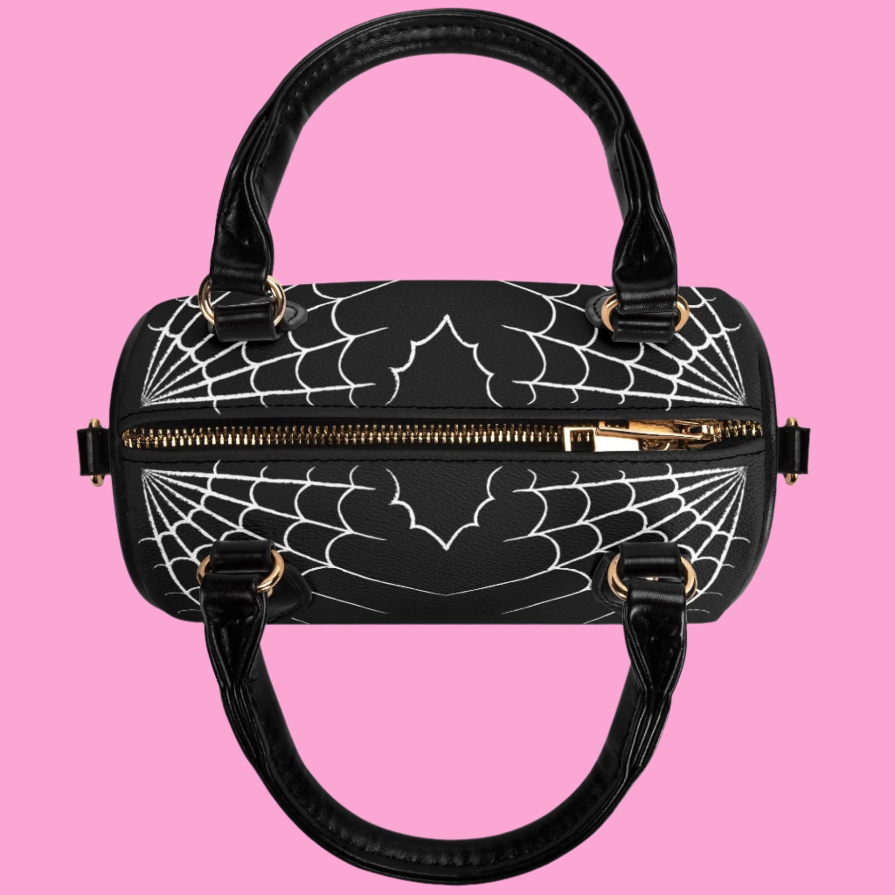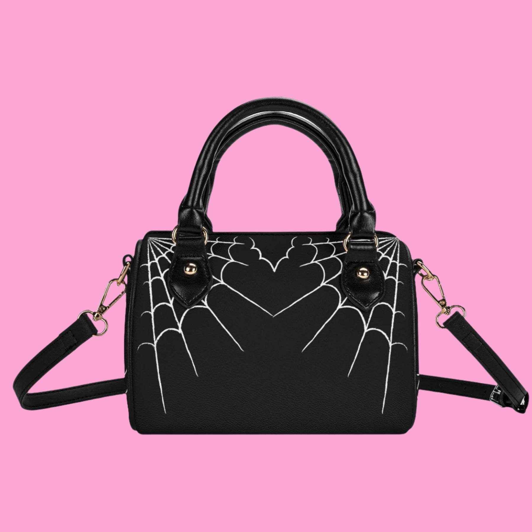 Unleash your dark charm with the Webs of Delight Mini Bowler Purse, where eerie white spiderwebs are embroidered onto a bewitching barrel-style design! Inside, you'll discover a wickedly fun green and black spiderweb lining that’s as hauntingly stylish as it is unexpected. With a crossbody strap and short handles, this purse lets you carry your spooky flair however you like—whether you’re creeping through the night or casting a spell with every step. This is a smaller purse so please check the measurements before ordering.