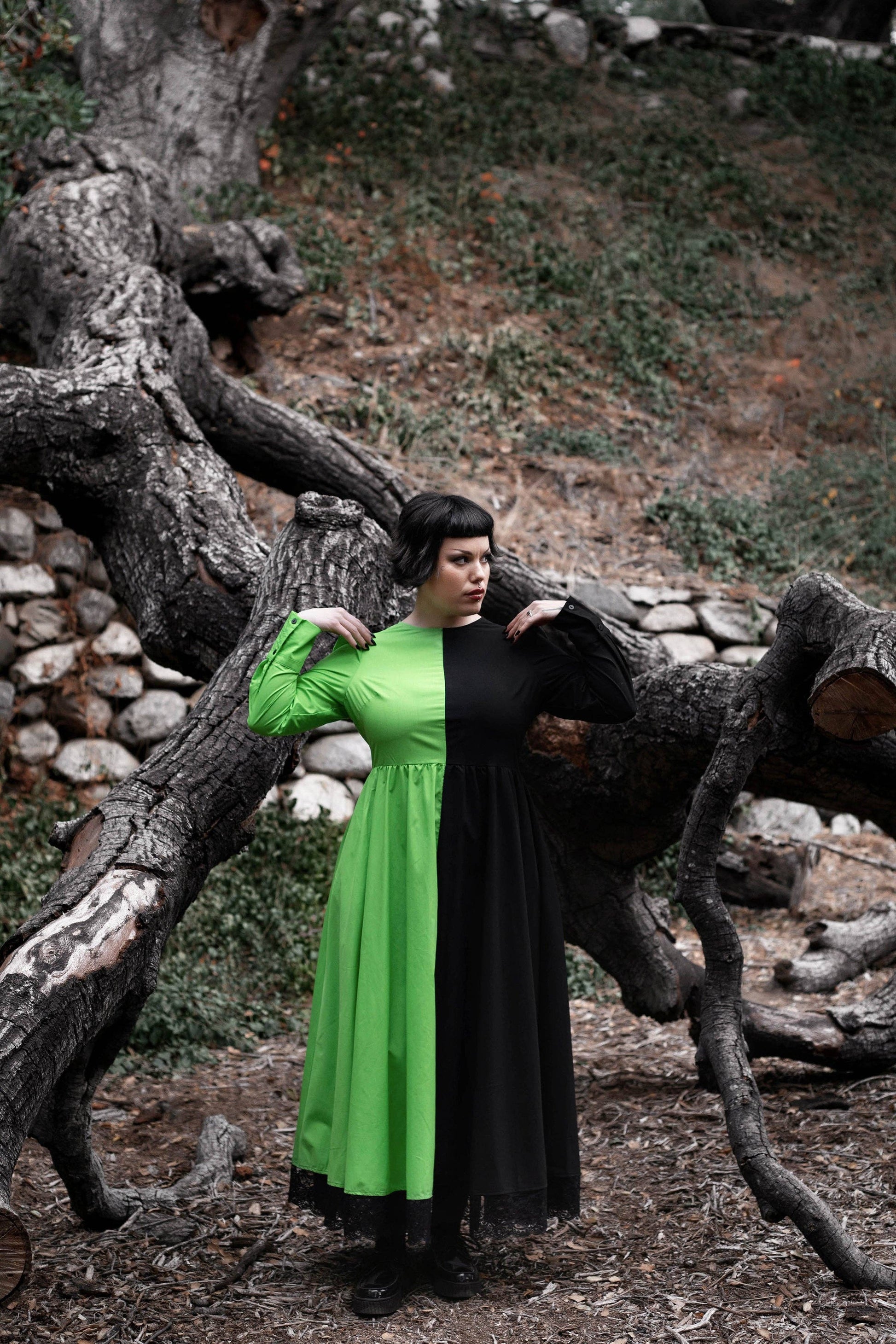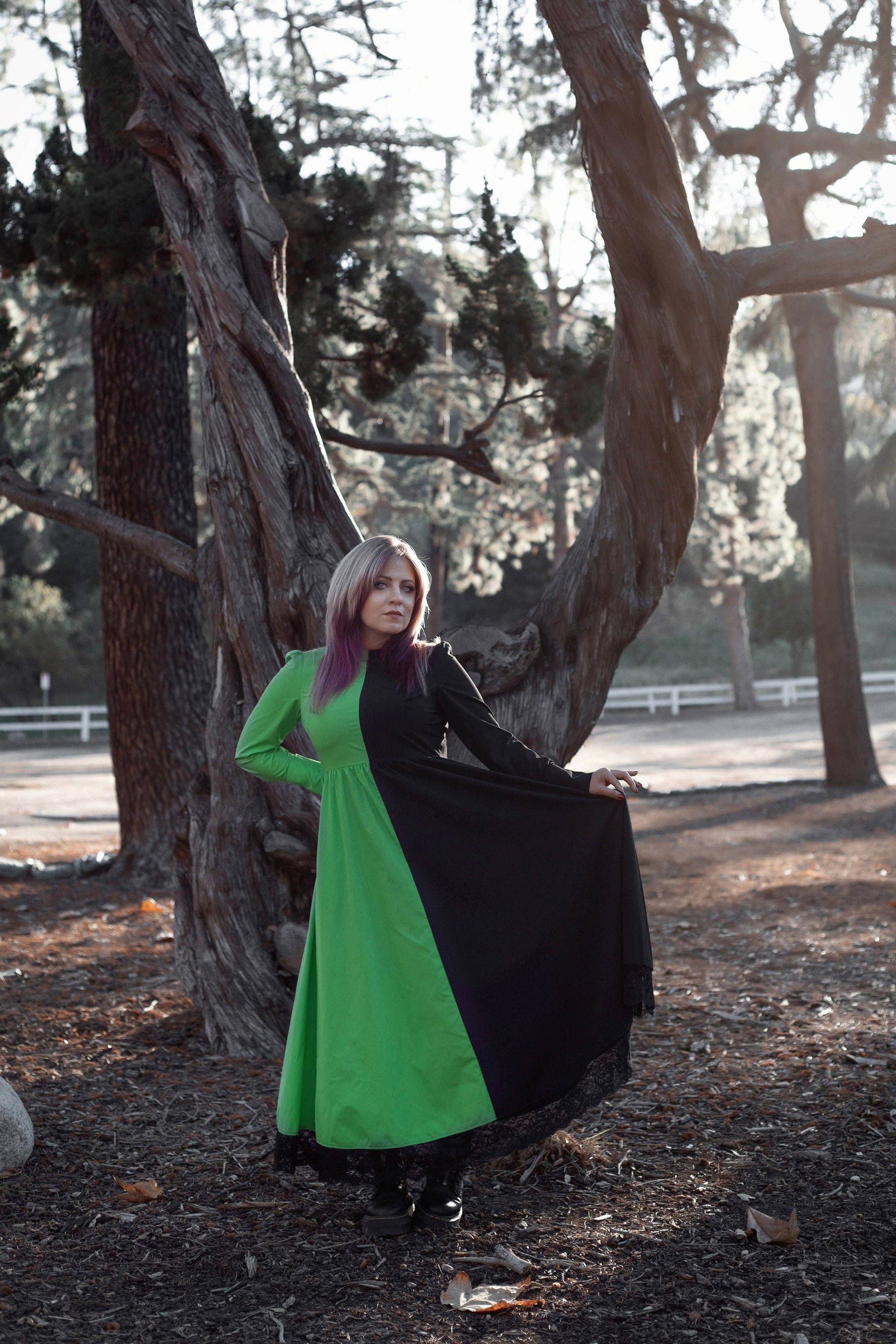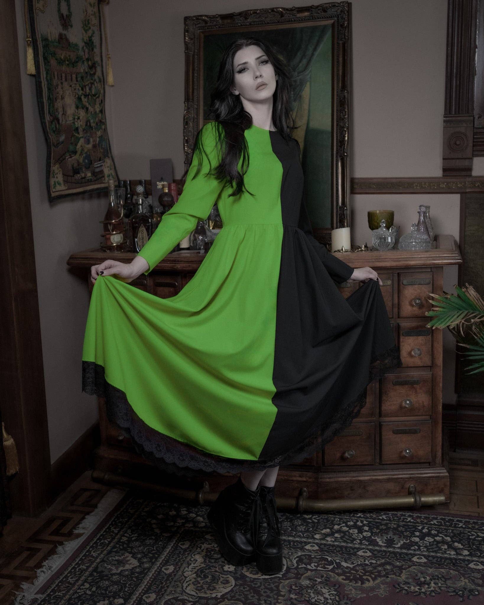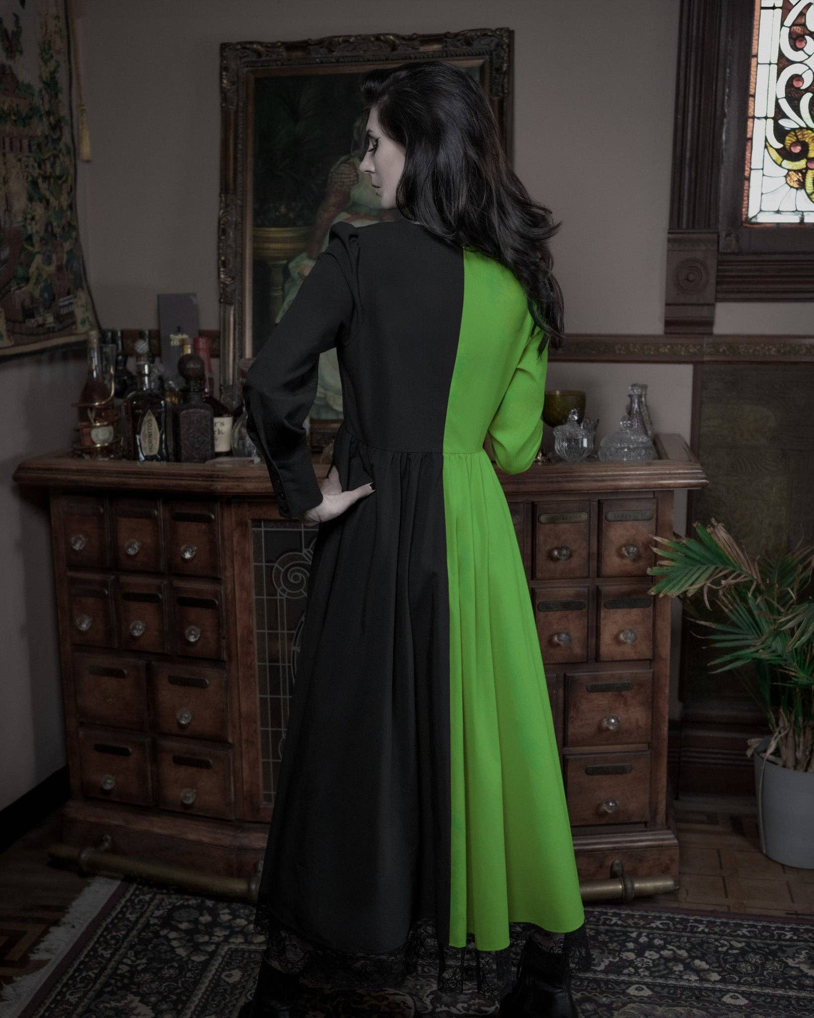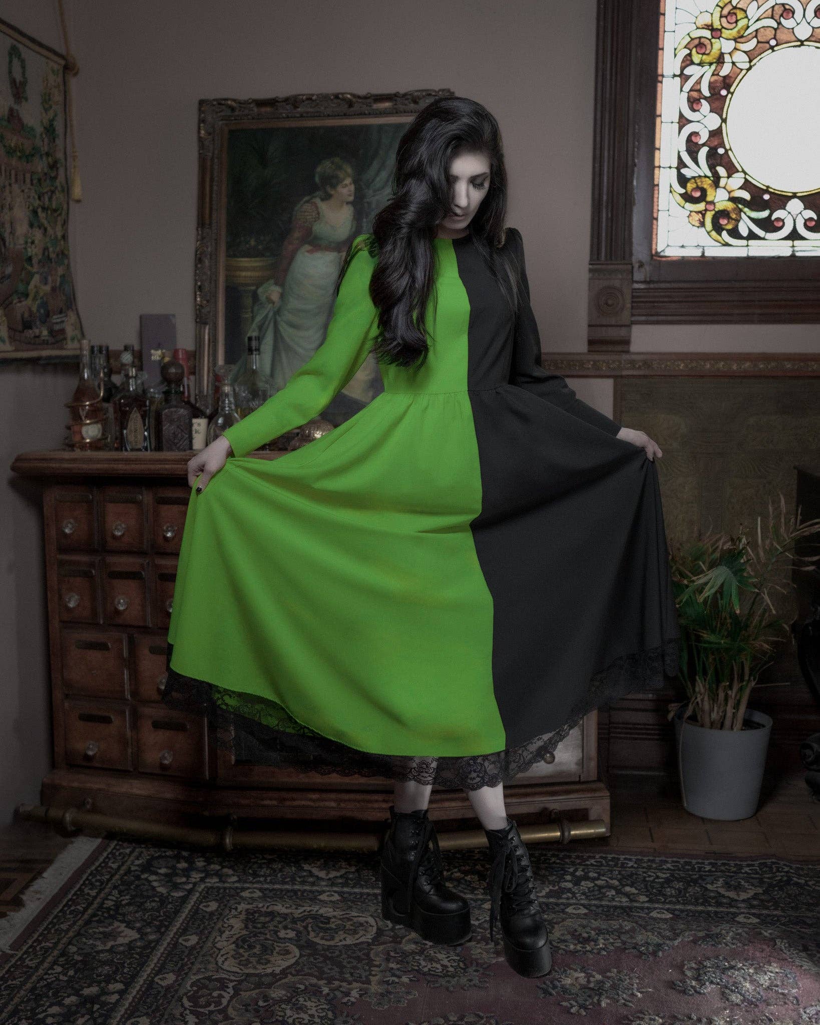 The "Wicked Lady" Dress is a vintage-inspired masterpiece. Made from a soft woven fabric of polyester, rayon, and spandex, this dress features long sleeves with a hint of puff, a chic split color design, and a delicate lace bottom. With newly added pockets and a cinched waist, this dress is both stylish and functional. Complete with a center back invisible zipper.