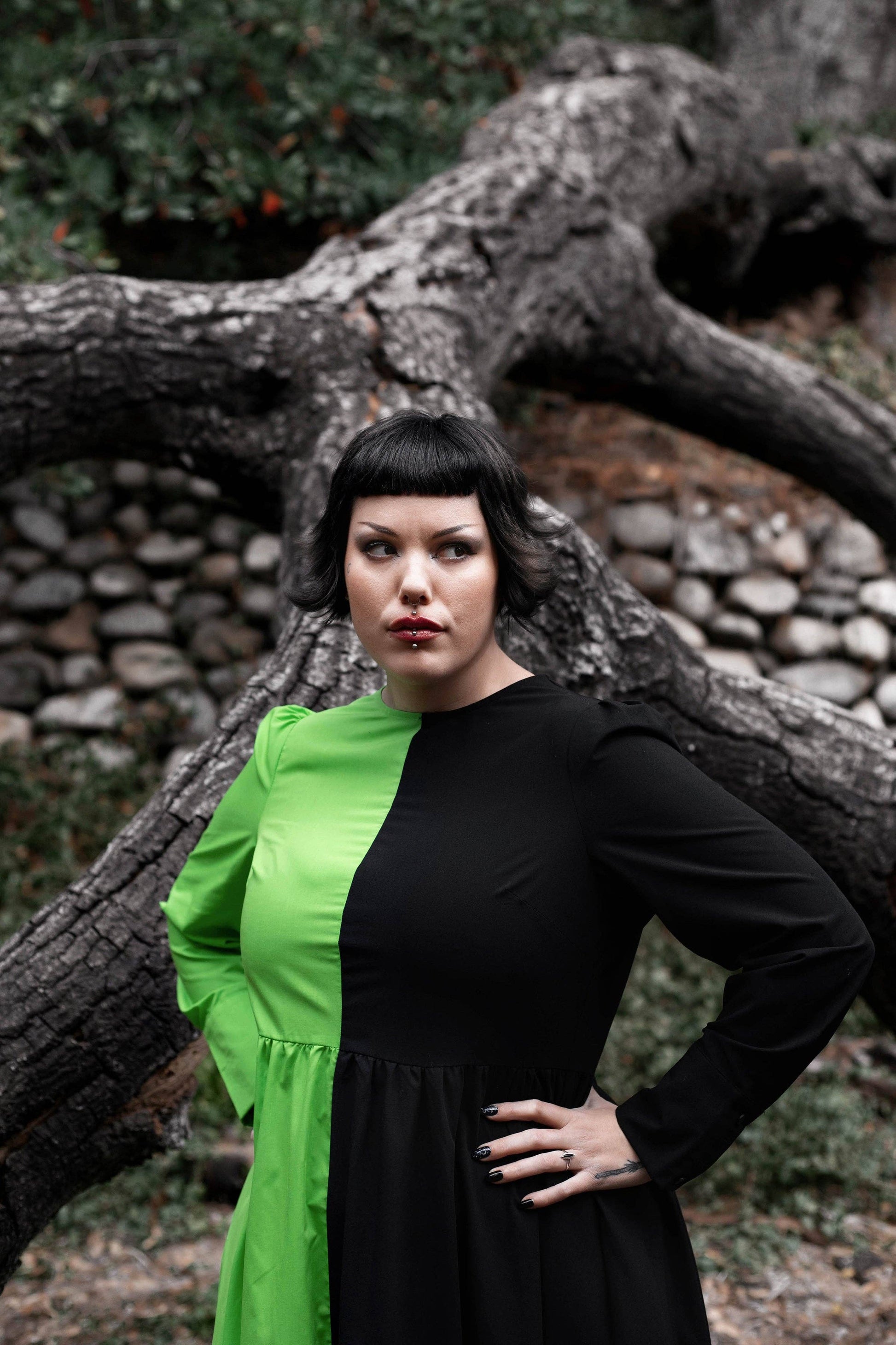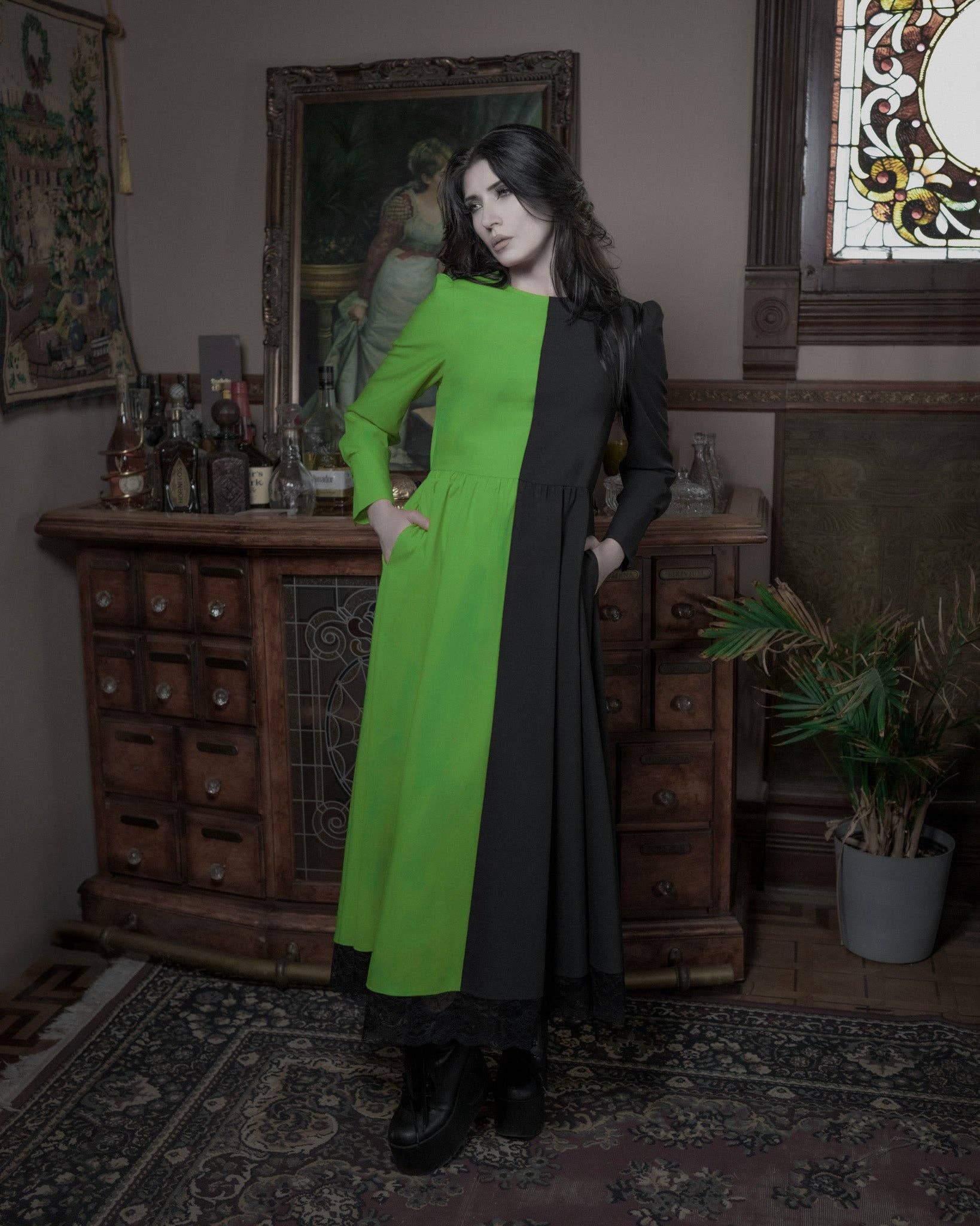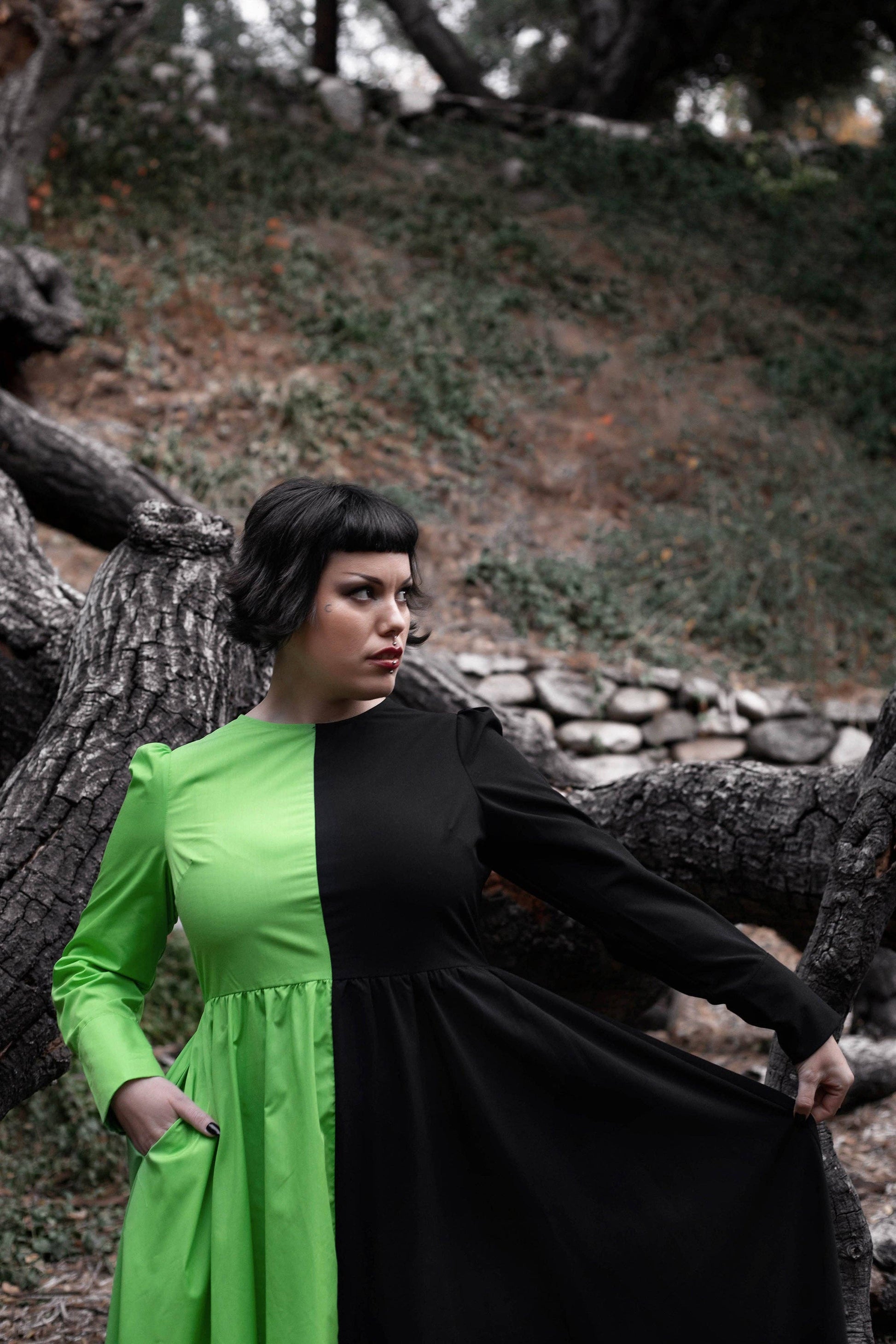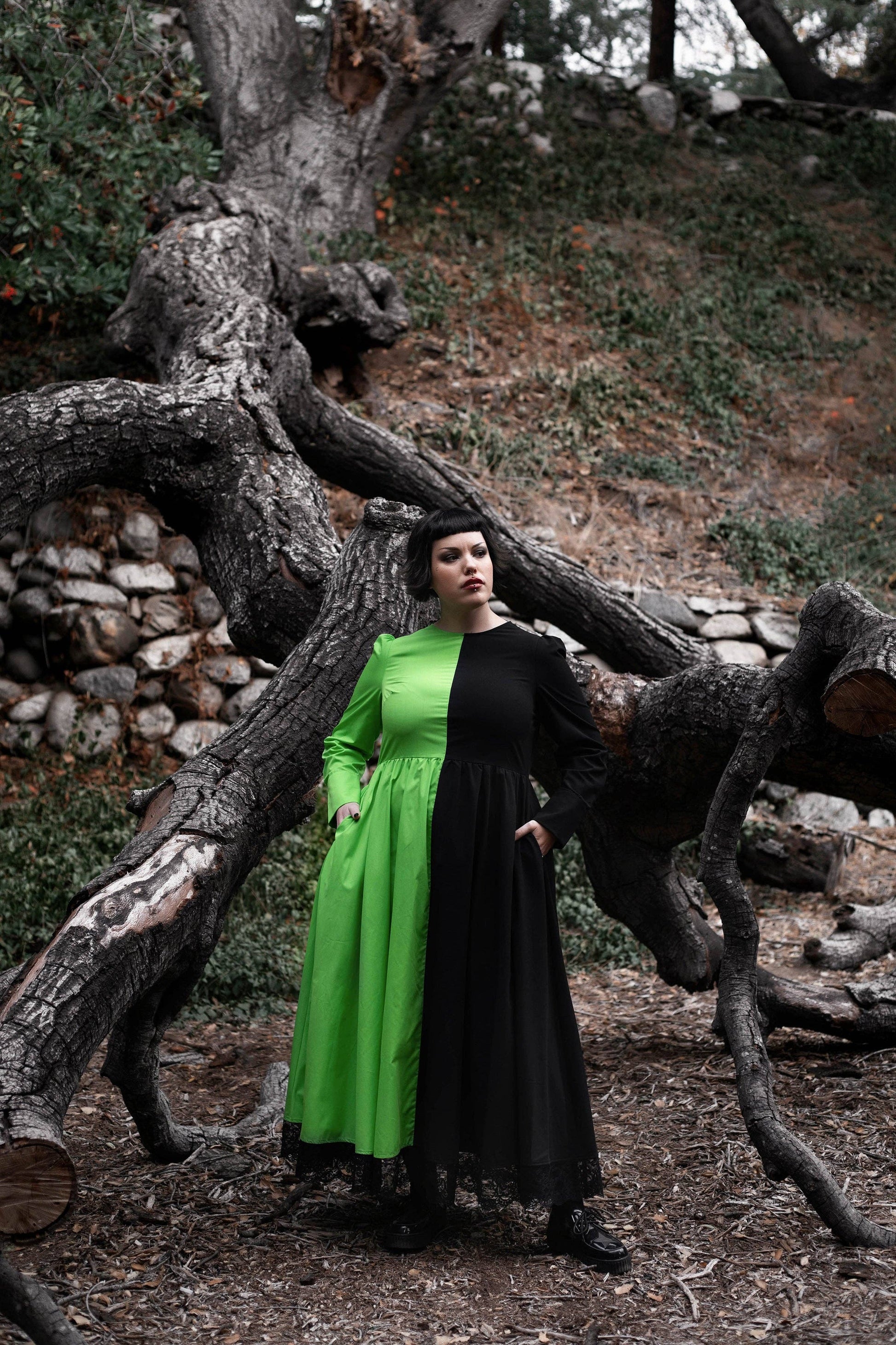 The "Wicked Lady" Dress is a vintage-inspired masterpiece. Made from a soft woven fabric of polyester, rayon, and spandex, this dress features long sleeves with a hint of puff, a chic split color design, and a delicate lace bottom. With newly added pockets and a cinched waist, this dress is both stylish and functional. Complete with a center back invisible zipper.