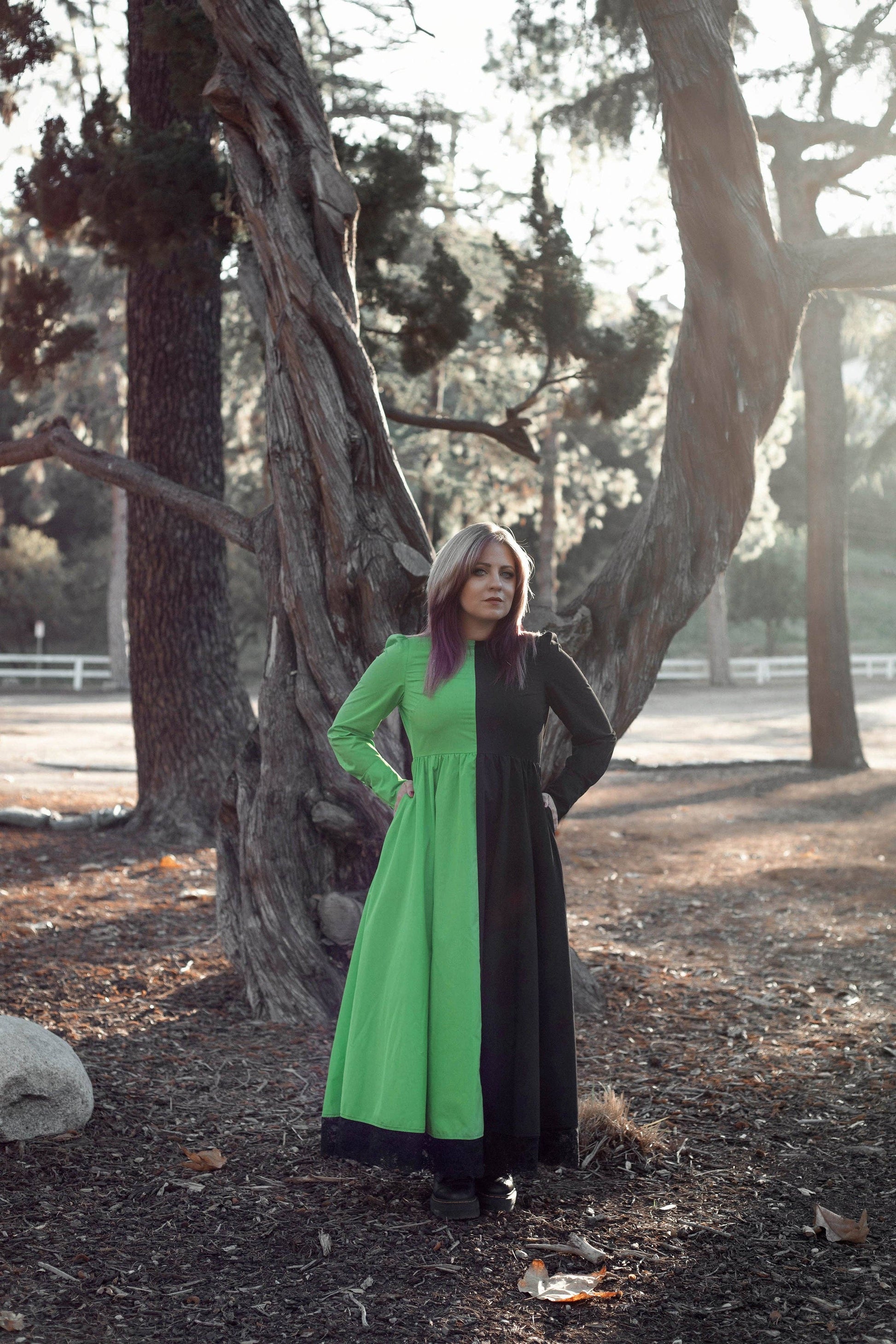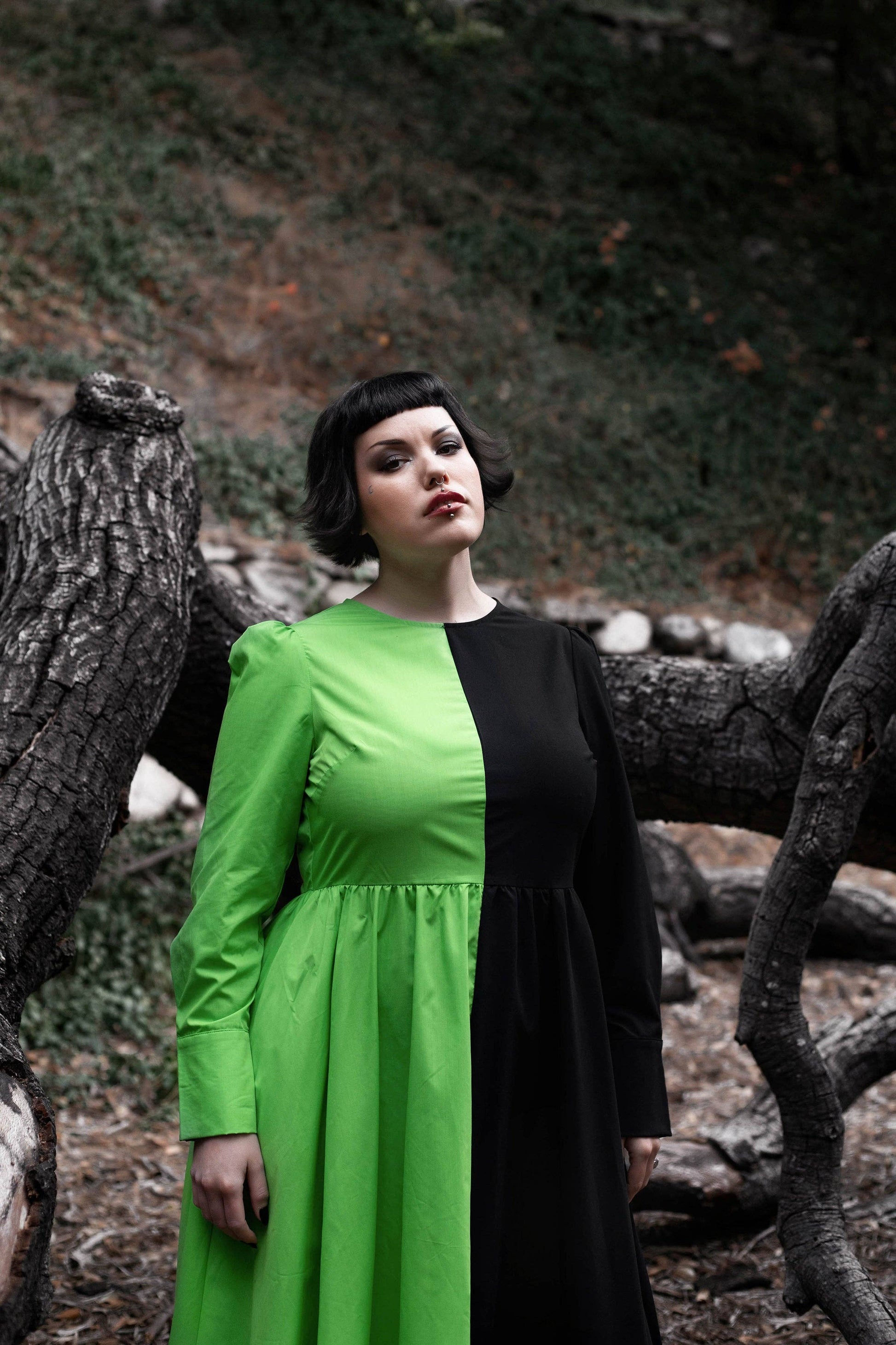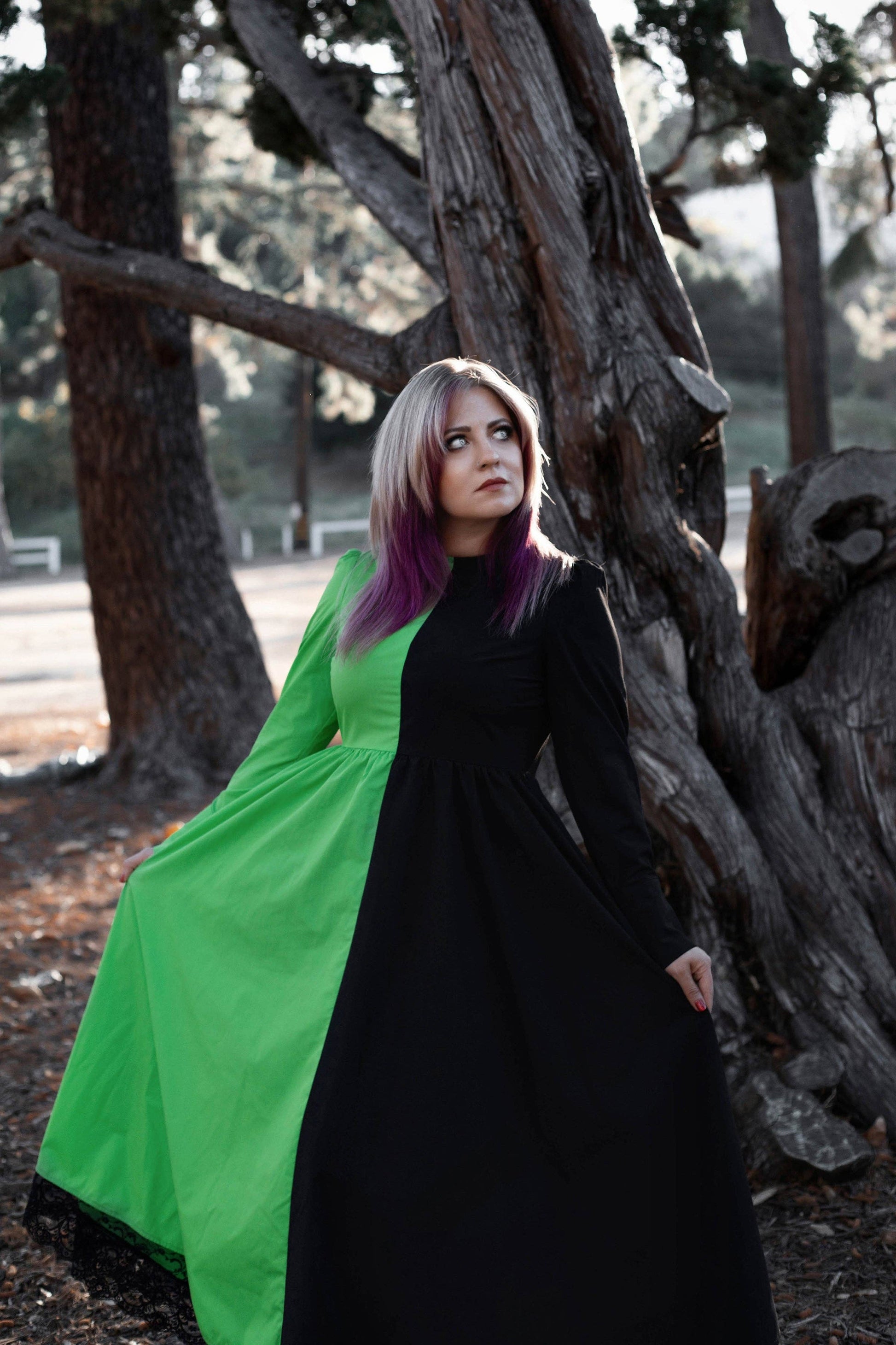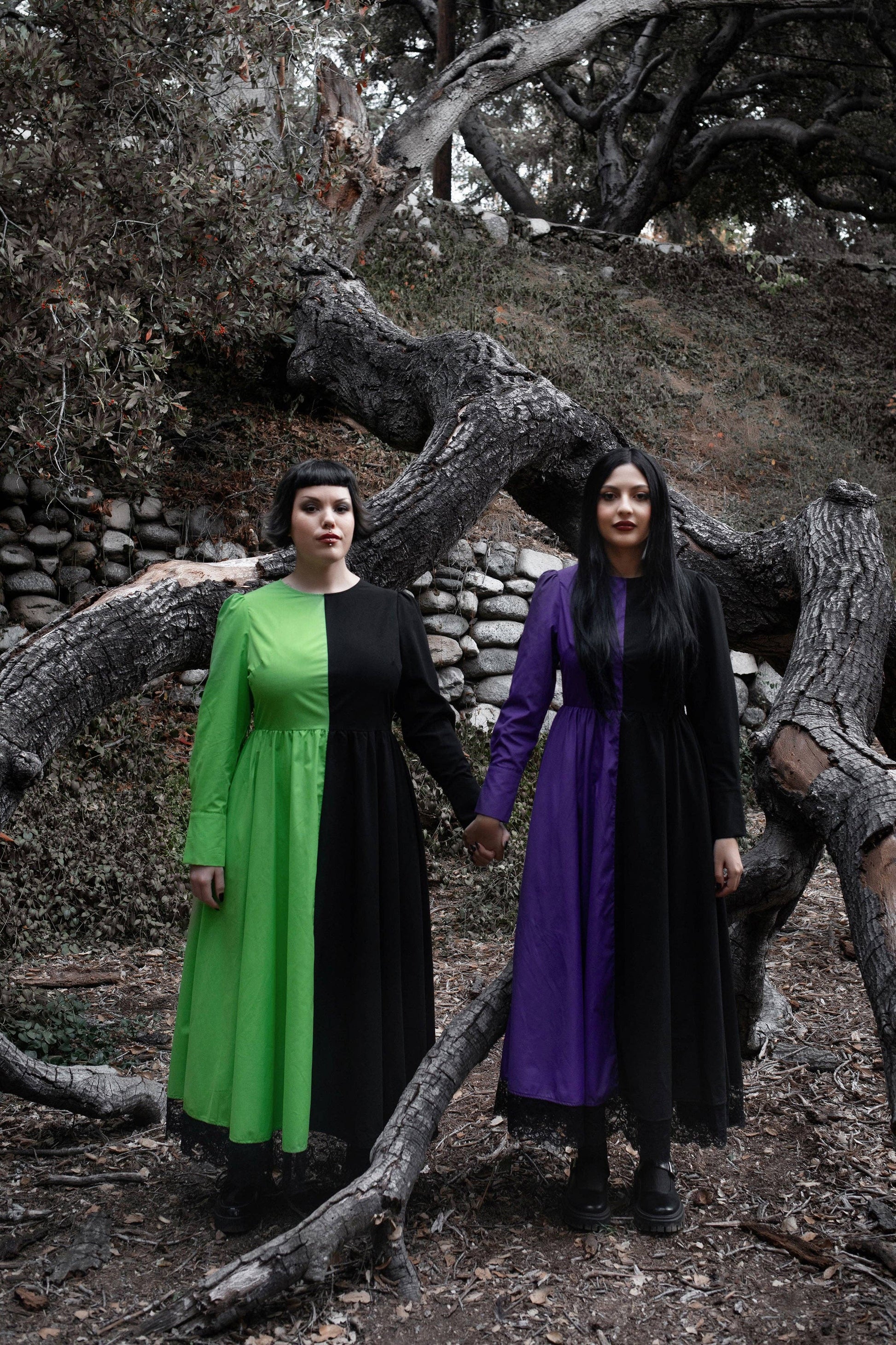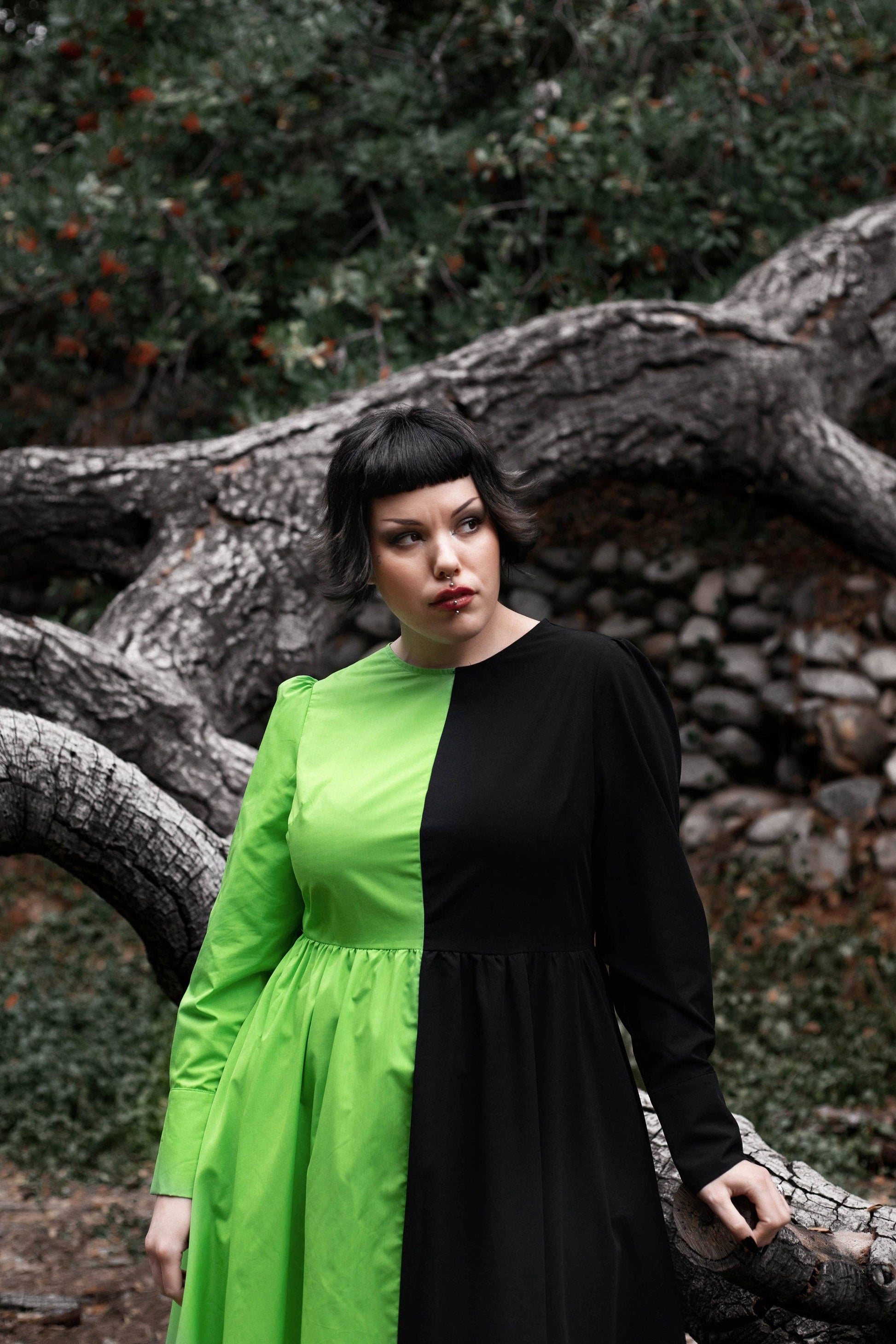 The "Wicked Lady" Dress is a vintage-inspired masterpiece. Made from a soft woven fabric of polyester, rayon, and spandex, this dress features long sleeves with a hint of puff, a chic split color design, and a delicate lace bottom. With newly added pockets and a cinched waist, this dress is both stylish and functional. Complete with a center back invisible zipper.
