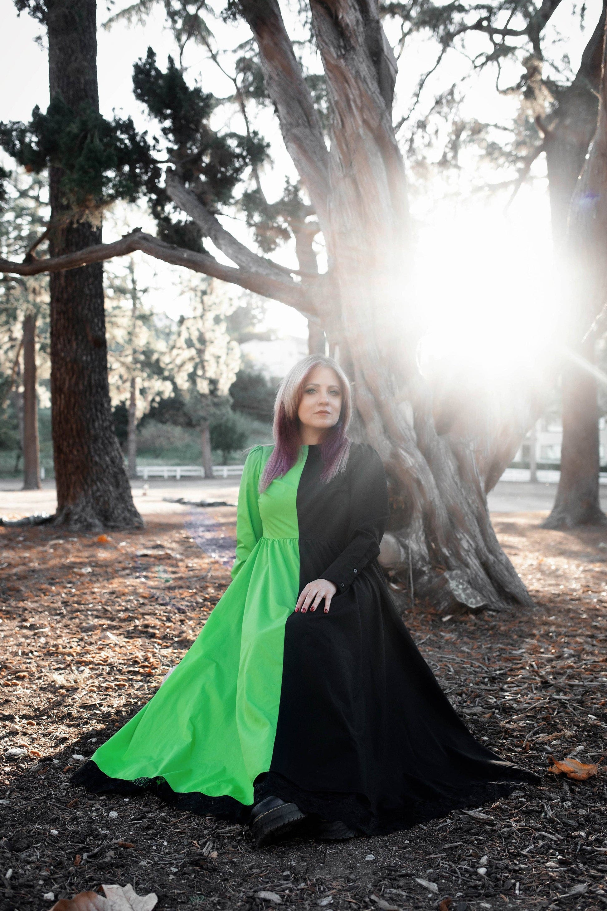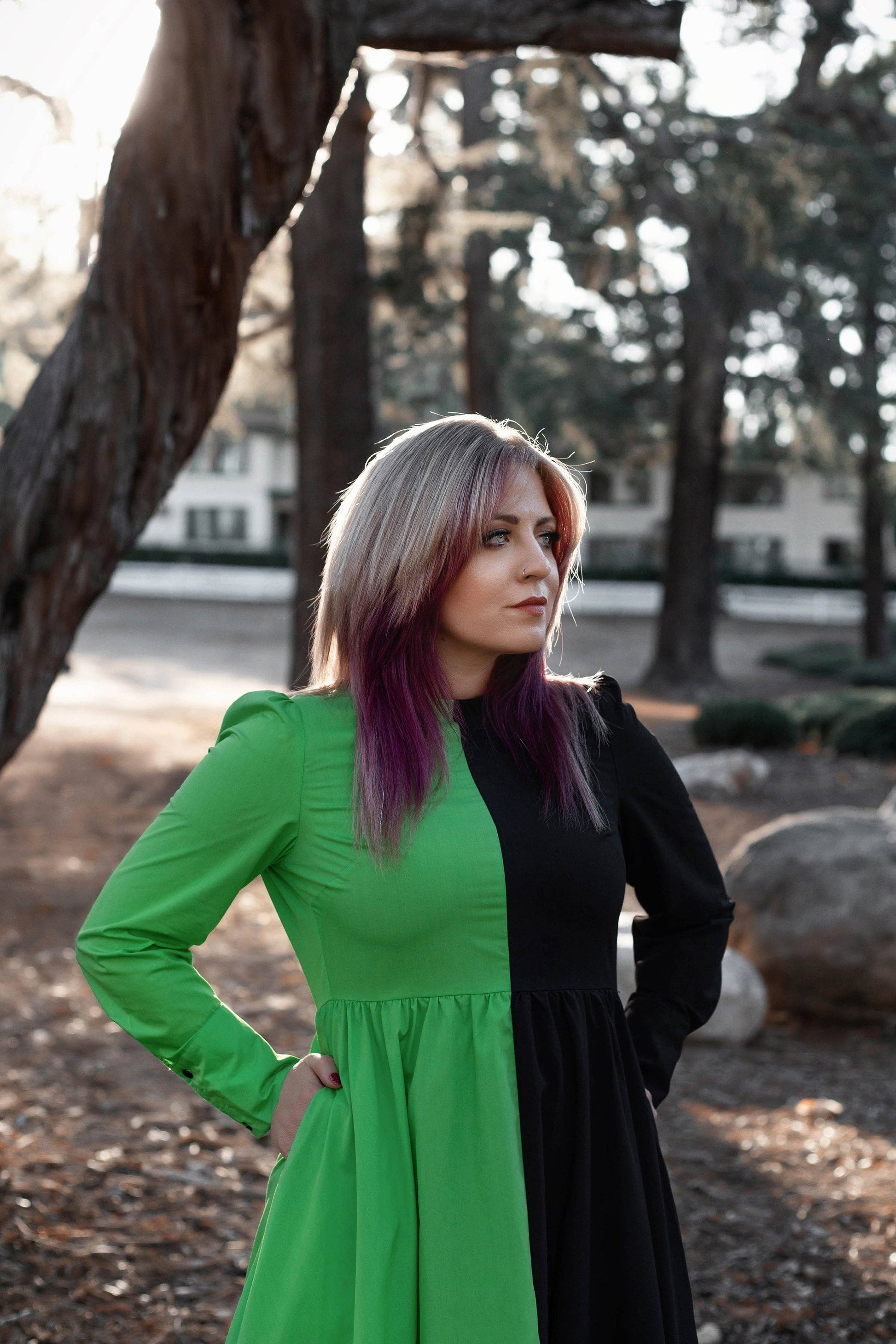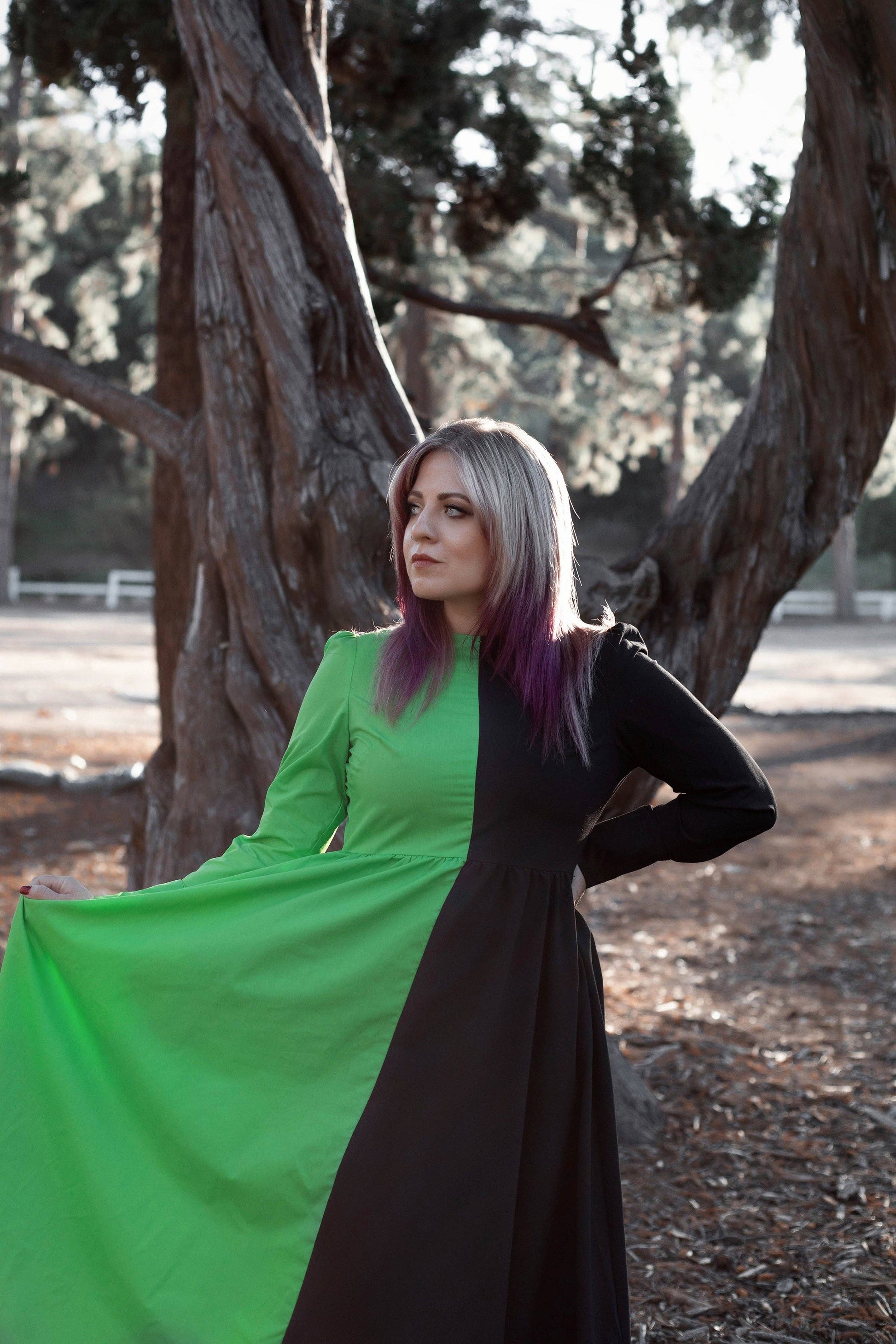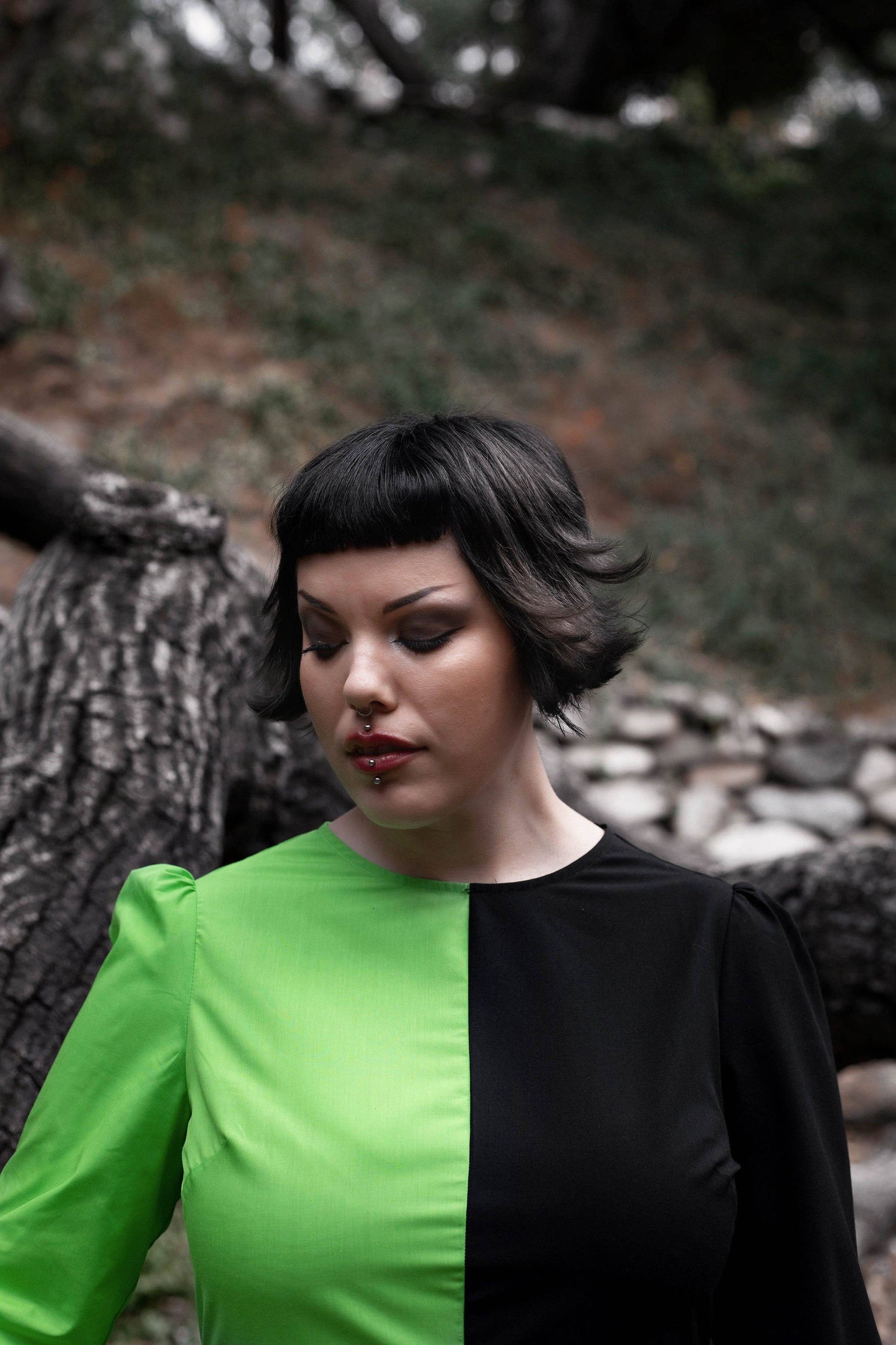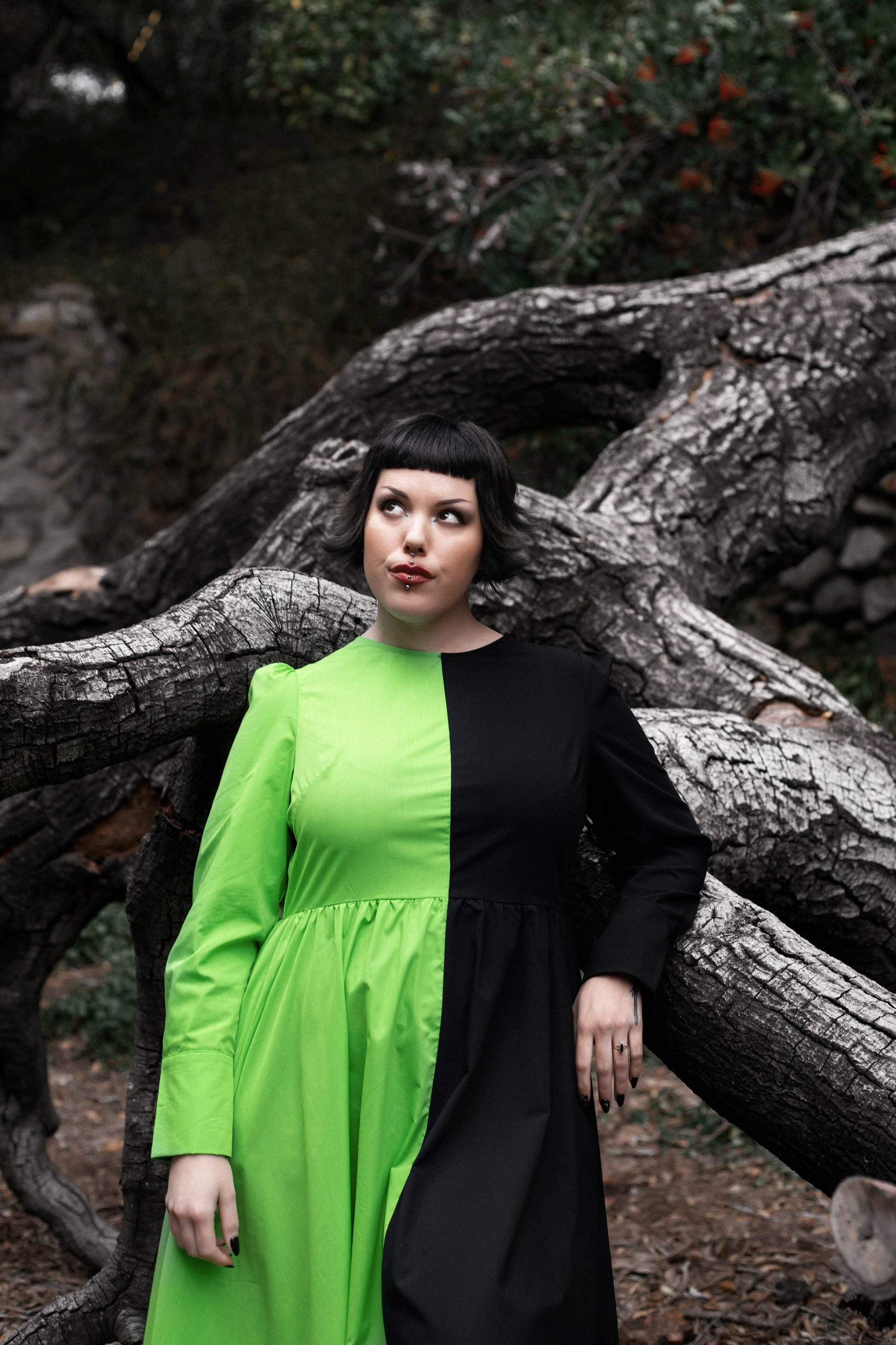 The "Wicked Lady" Dress is a vintage-inspired masterpiece. Made from a soft woven fabric of polyester, rayon, and spandex, this dress features long sleeves with a hint of puff, a chic split color design, and a delicate lace bottom. With newly added pockets and a cinched waist, this dress is both stylish and functional. Complete with a center back invisible zipper.